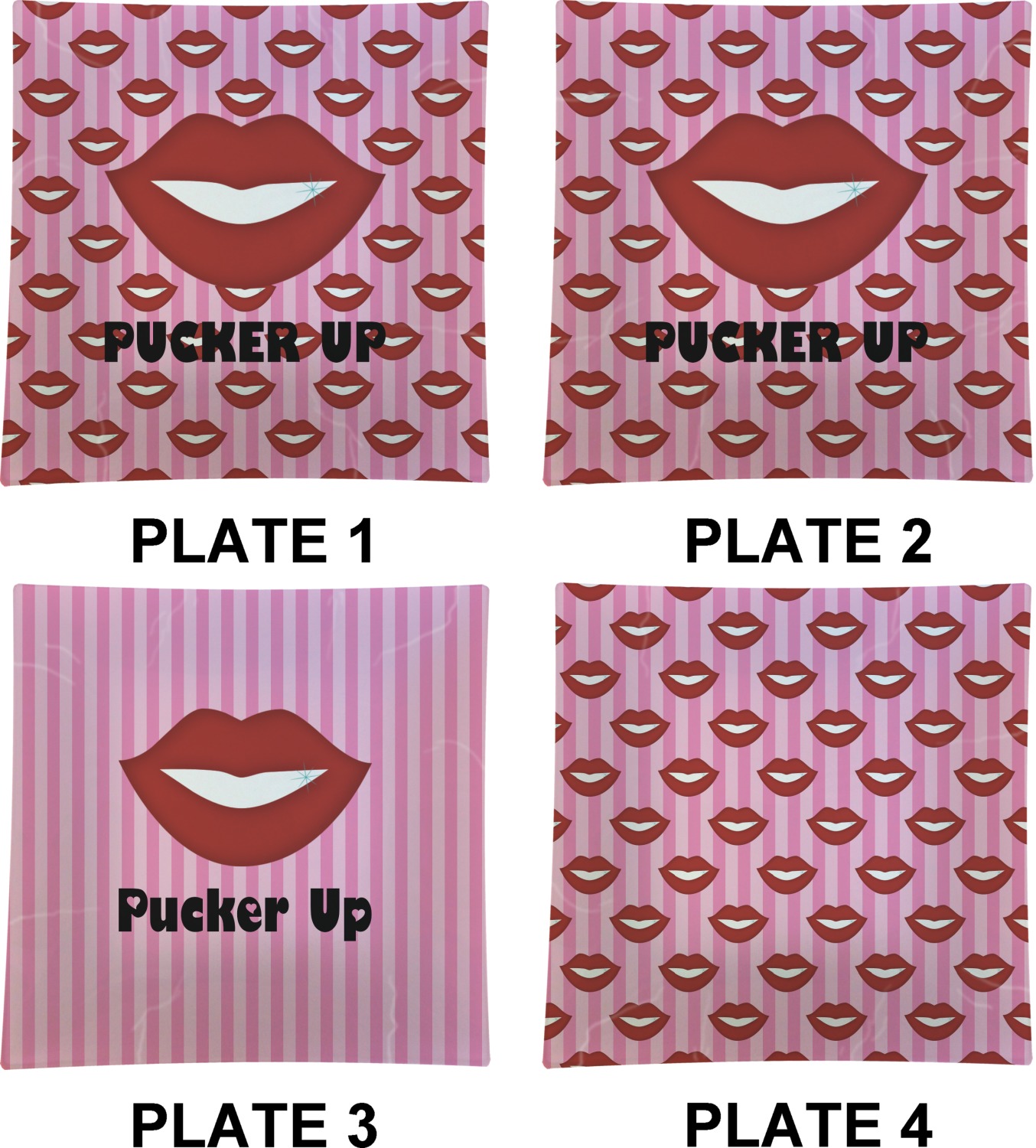 This Lips / Pucker Up design was created by very own Tina D'Astoli for her make up bag. We thought it was beautiful enough to convert to a full fledged design for all our products. It is a layered design with striped in the background (Tina of course chose pink; the stripes are re-color-able), layered with lips. Tina also chose to the use a large graphic and text layout - with lips and the words "Pucker Up" in a black with the Holes are Hearts font.