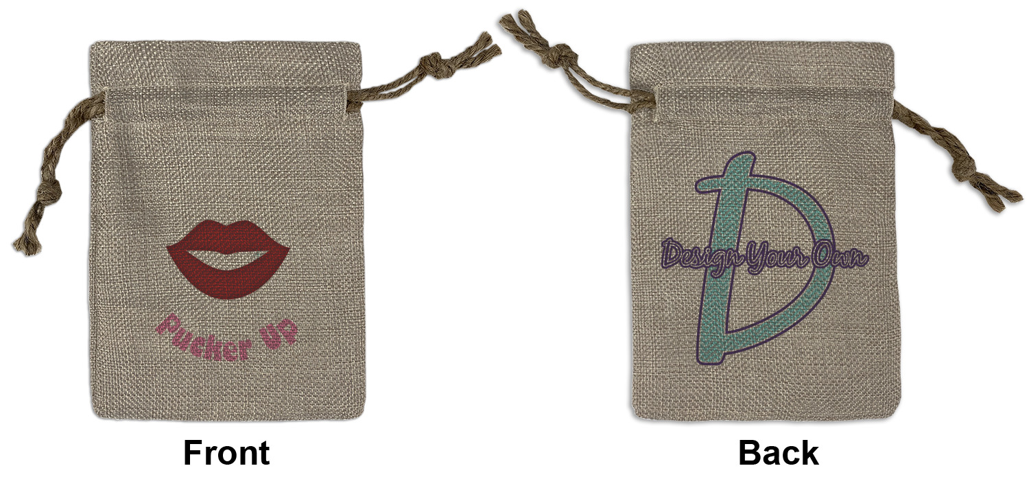 We sell our Burlap Gift Bags in 3 variant sized bags. Made with burlap polyester, each personalized bag can be secured with a twine drawstring pull. Your custom design is available to print on one side or both sides - completely up to you! The sizes of the bags measure approximately 4.5" x 6.5" for the smallest size, 6.5" x 8.0" for the medium size, and 6.5" x 13.5" for the large-sized bag.