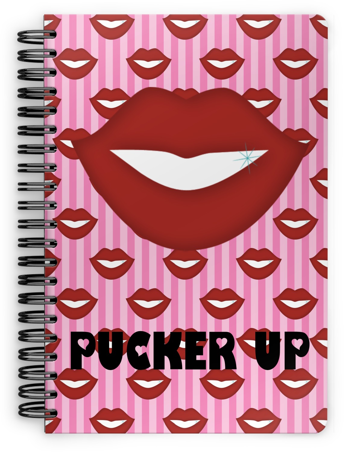 This Lips / Pucker Up design was created by very own Tina D'Astoli for her make up bag. We thought it was beautiful enough to convert to a full fledged design for all our products. It is a layered design with striped in the background (Tina of course chose pink; the stripes are re-color-able), layered with lips. Tina also chose to the use a large graphic and text layout - with lips and the words "Pucker Up" in a black with the Holes are Hearts font.