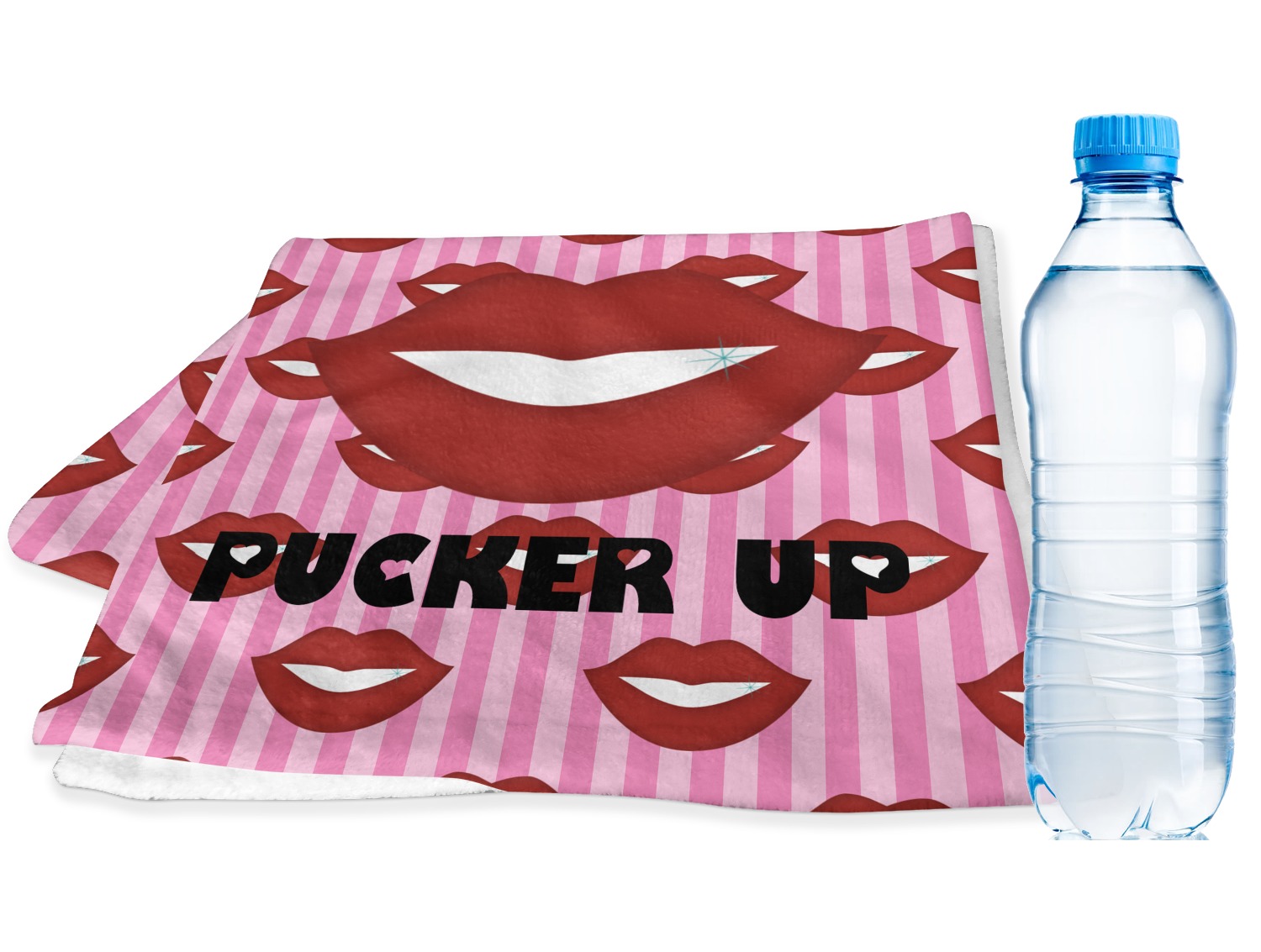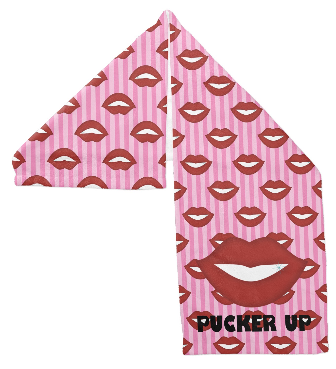 This Lips / Pucker Up design was created by very own Tina D'Astoli for her make up bag. We thought it was beautiful enough to convert to a full fledged design for all our products. It is a layered design with striped in the background (Tina of course chose pink; the stripes are re-color-able), layered with lips. Tina also chose to the use a large graphic and text layout - with lips and the words "Pucker Up" in a black with the Holes are Hearts font.