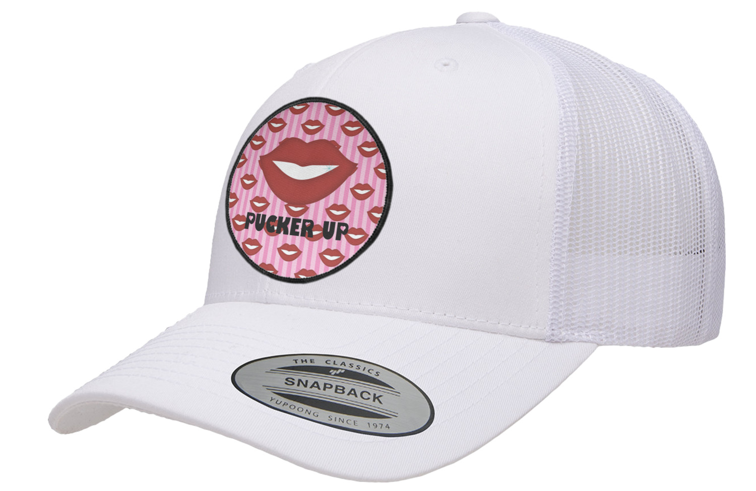 This Lips / Pucker Up design was created by very own Tina D'Astoli for her make up bag. We thought it was beautiful enough to convert to a full fledged design for all our products. It is a layered design with striped in the background (Tina of course chose pink; the stripes are re-color-able), layered with lips. Tina also chose to the use a large graphic and text layout - with lips and the words "Pucker Up" in a black with the Holes are Hearts font.