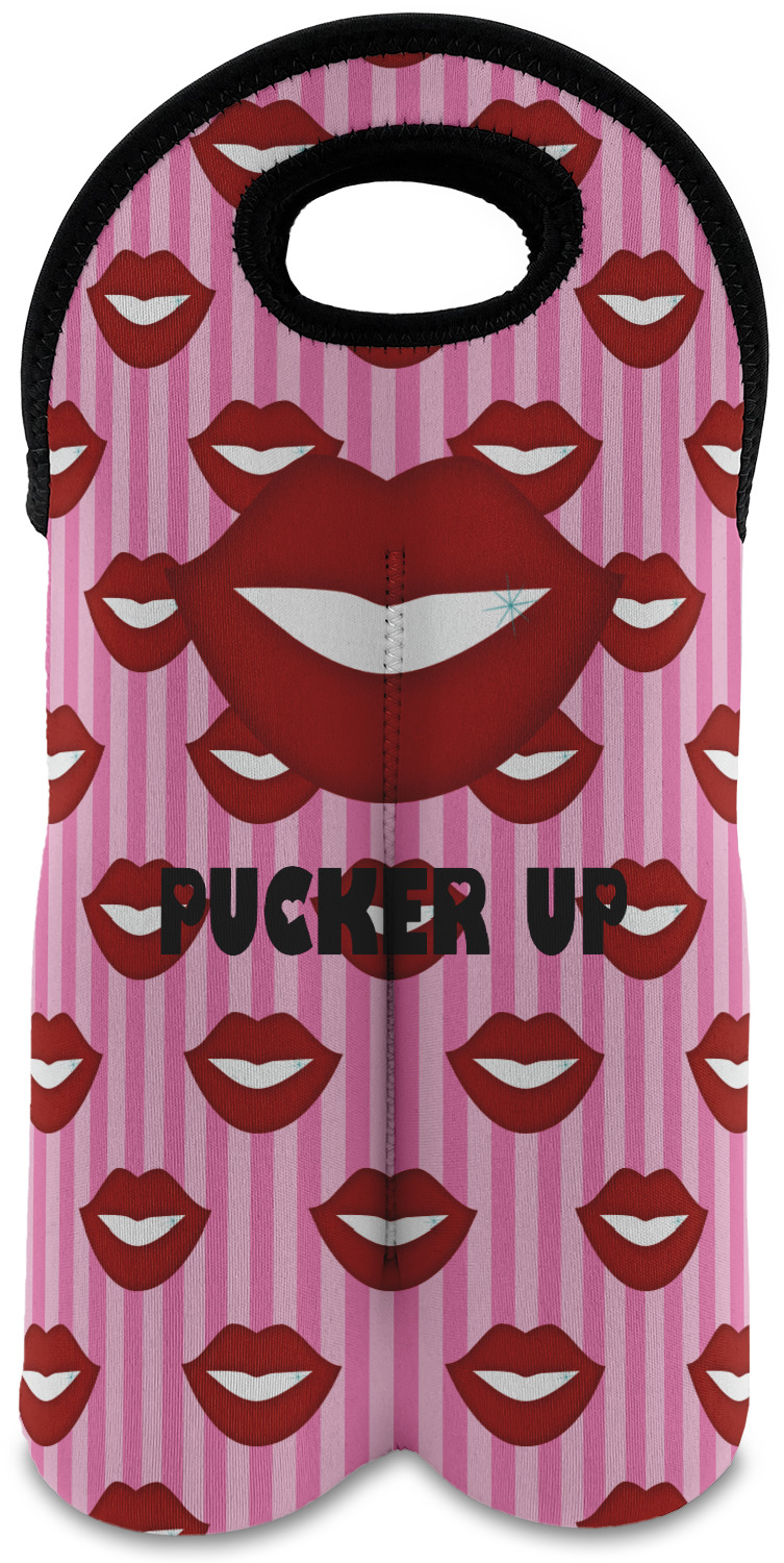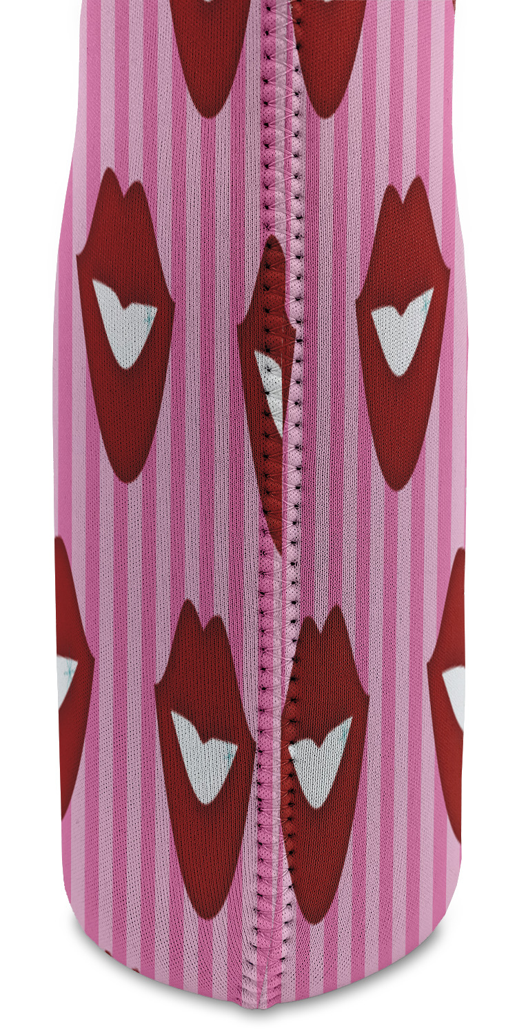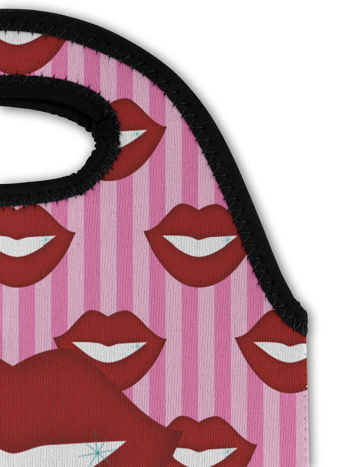 This Lips / Pucker Up design was created by very own Tina D'Astoli for her make up bag. We thought it was beautiful enough to convert to a full fledged design for all our products. It is a layered design with striped in the background (Tina of course chose pink; the stripes are re-color-able), layered with lips. Tina also chose to the use a large graphic and text layout - with lips and the words "Pucker Up" in a black with the Holes are Hearts font.