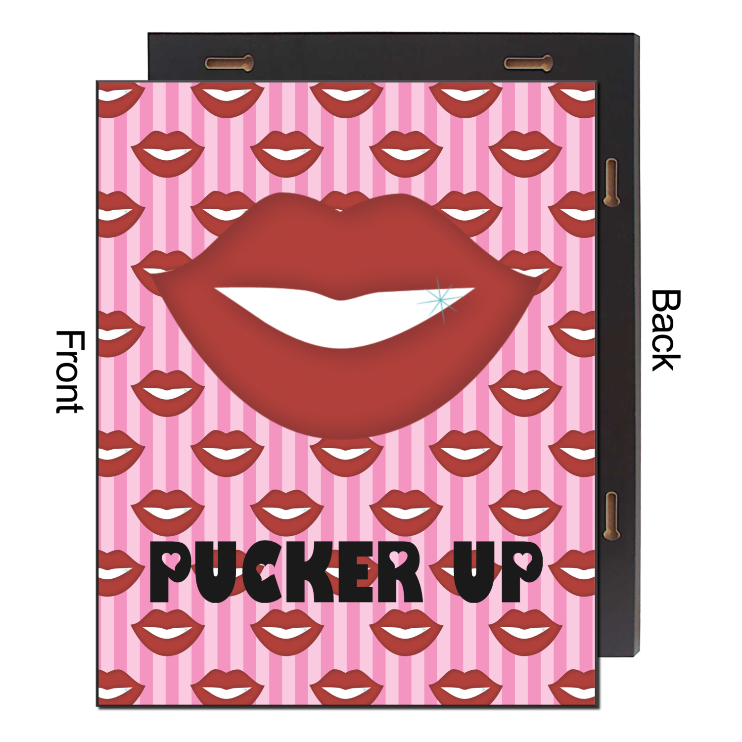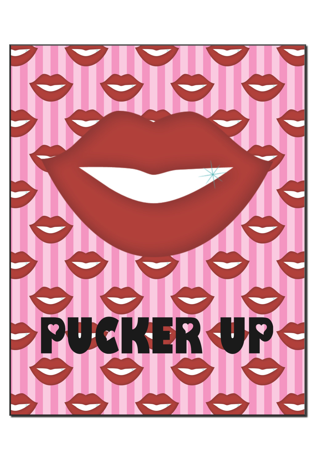 This Lips / Pucker Up design was created by very own Tina D'Astoli for her make up bag. We thought it was beautiful enough to convert to a full fledged design for all our products. It is a layered design with striped in the background (Tina of course chose pink; the stripes are re-color-able), layered with lips. Tina also chose to the use a large graphic and text layout - with lips and the words "Pucker Up" in a black with the Holes are Hearts font.