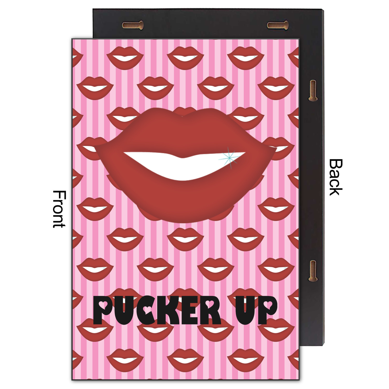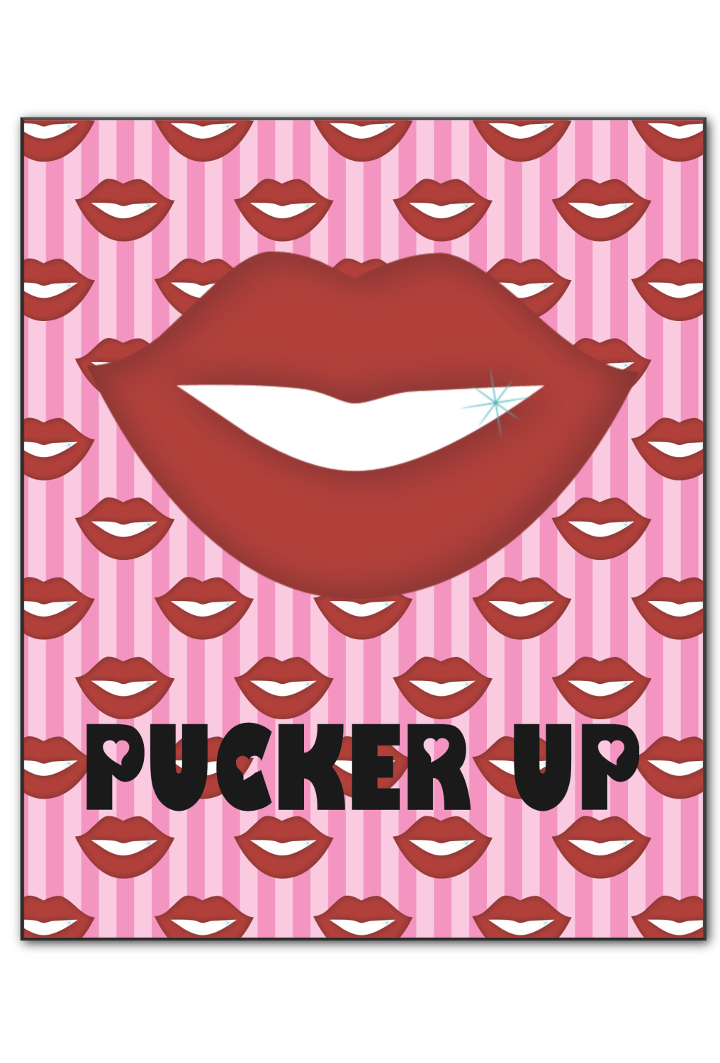 This Lips / Pucker Up design was created by very own Tina D'Astoli for her make up bag. We thought it was beautiful enough to convert to a full fledged design for all our products. It is a layered design with striped in the background (Tina of course chose pink; the stripes are re-color-able), layered with lips. Tina also chose to the use a large graphic and text layout - with lips and the words "Pucker Up" in a black with the Holes are Hearts font.