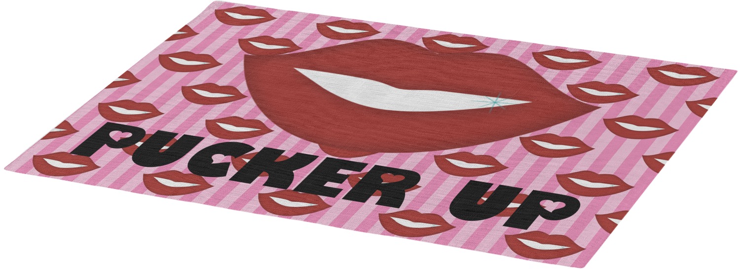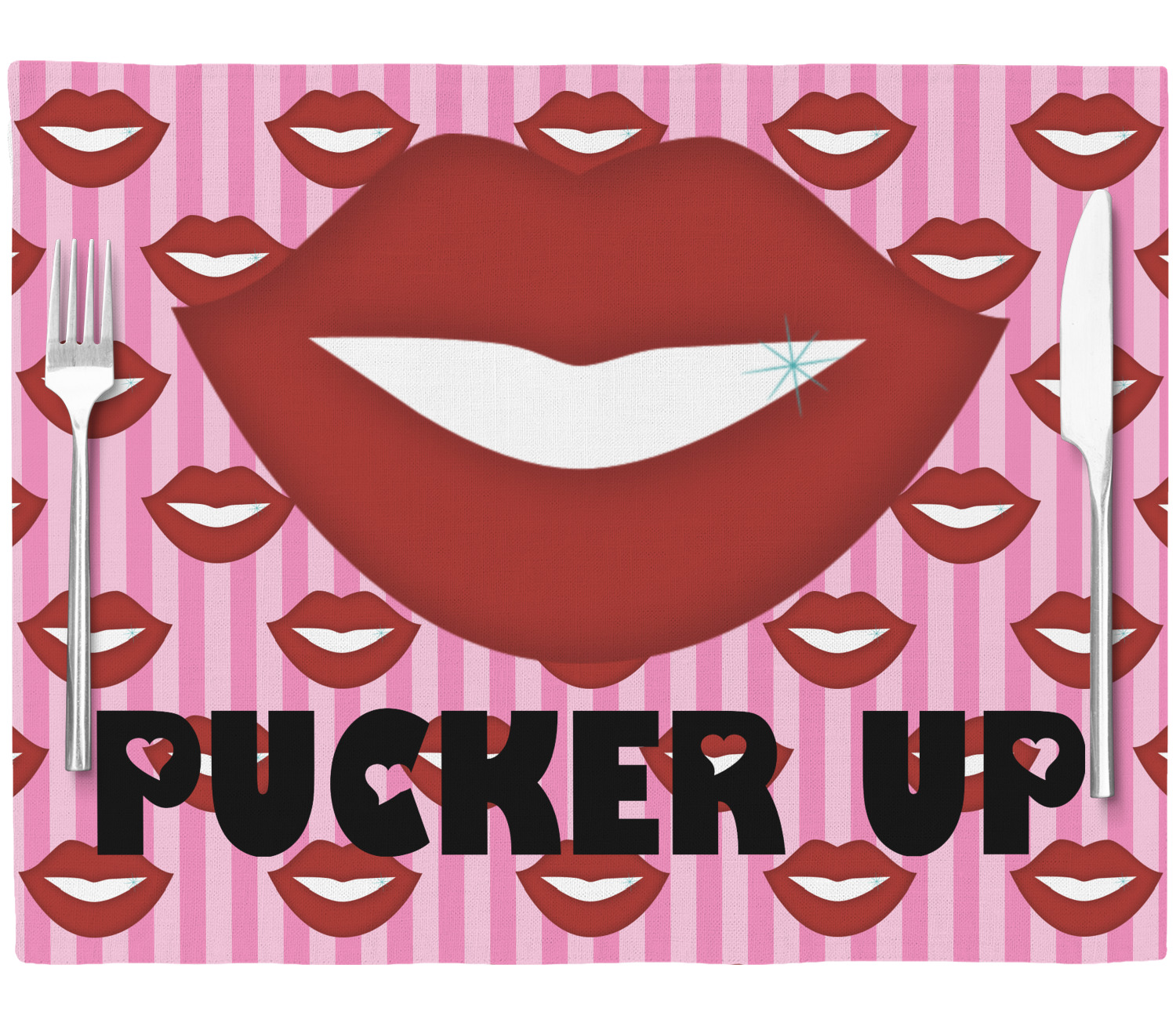 This Lips / Pucker Up design was created by very own Tina D'Astoli for her make up bag. We thought it was beautiful enough to convert to a full fledged design for all our products. It is a layered design with striped in the background (Tina of course chose pink; the stripes are re-color-able), layered with lips. Tina also chose to the use a large graphic and text layout - with lips and the words "Pucker Up" in a black with the Holes are Hearts font.