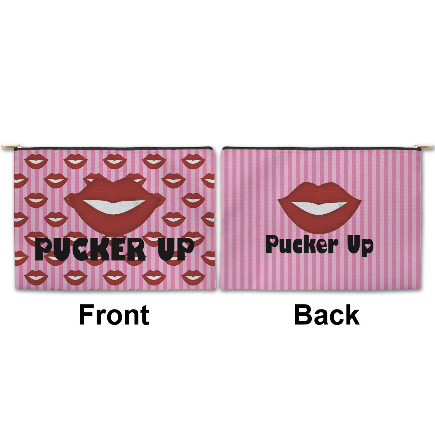 This Lips / Pucker Up design was created by very own Tina D'Astoli for her make up bag. We thought it was beautiful enough to convert to a full fledged design for all our products. It is a layered design with striped in the background (Tina of course chose pink; the stripes are re-color-able), layered with lips. Tina also chose to the use a large graphic and text layout - with lips and the words "Pucker Up" in a black with the Holes are Hearts font.