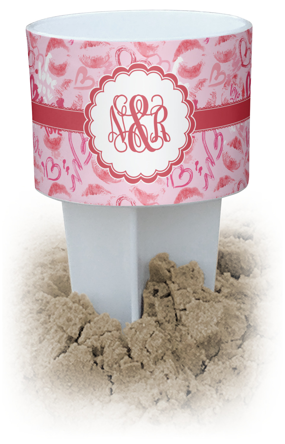 This cup holder has a large stake at its bottom that anchors it to the sand or ground below, while the cup holder rests above the stake. The entire drink holder is made of durable plastic and displays your customization around the cup holder portion. We sell these personalized beach spikers in two different colors: black and white.