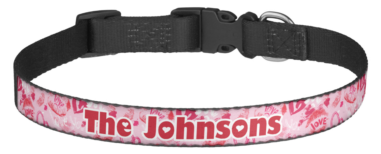 This sturdy collar, made from a durable nylon weave, will outlive your dog's episodes of excited tugging and pulling. Courtesy of its thick plastic buckle and adjuster, this collar is adjustable and accommodating of any dog. Structurally, the collar is a single piece of nylon weave that is sewn together, and features a solid metal loop where you can attach a leash or dog tag. We print and display your dog's name and pattern across the middle of the personalized dog collar.