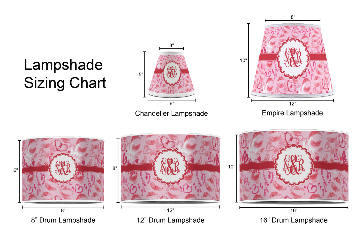 Our customized lamp shades also come in 3 different sizes: 8", 12" and 16", measuring at 8" in diameter by 6" tall, 12" in diameter by 8" tall, and 16" in diameter by 10" tall, respectively.