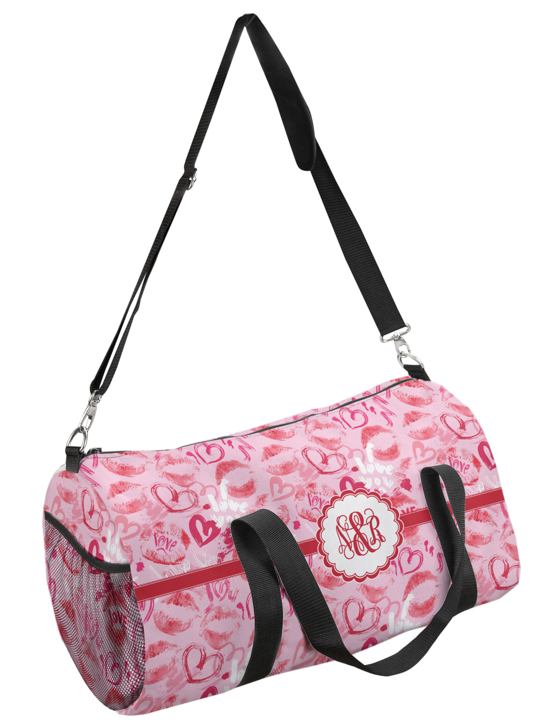 This duffle is a sturdy bag made of a canvas material. It comes in two sizes: Small (19"W x 9.5"H x 9.5"D) and Large (23"W x 12"H x 12"D). The bag is a cylindrical shape with a black adjustable strap and two handles. On one side is an elastic pouch to put a waterbottle or other small item. Your product will be sublimated with your design and is able to be designed on the front, back, and sides. Be sure to remember that the straps may cut into parts of your design if you upload your own artwork.