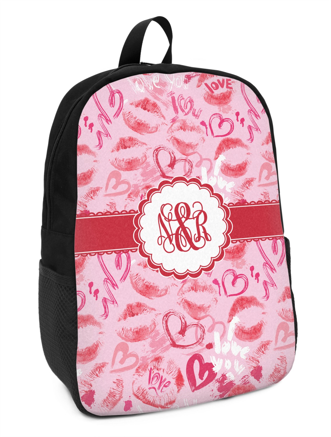 These small backpacks are made of a durable black canvas material with your personalization right on the front. The two shoulder straps are padded and easily adjustable. The bag itself measures at about 11" W x 15" H x 5" D. It's the perfect size for elementary aged kids or adults who want a smaller backpack. On the top of the bag you will find a handle to hang or carry your backpack by as well as a large zipper closure to keep all of your belongings safe inside. On each side of your backpack is a mesh pocket for a small item or water bottle. Inside your backpack you will find a spacious area with a small zipper pocket and a padded laptop slot that will fit up to a 13" laptop (13" being very snug). This is the perfect bag for any student that needs a couple books and their laptop with them at all times. It also works great as a carry on for traveling!