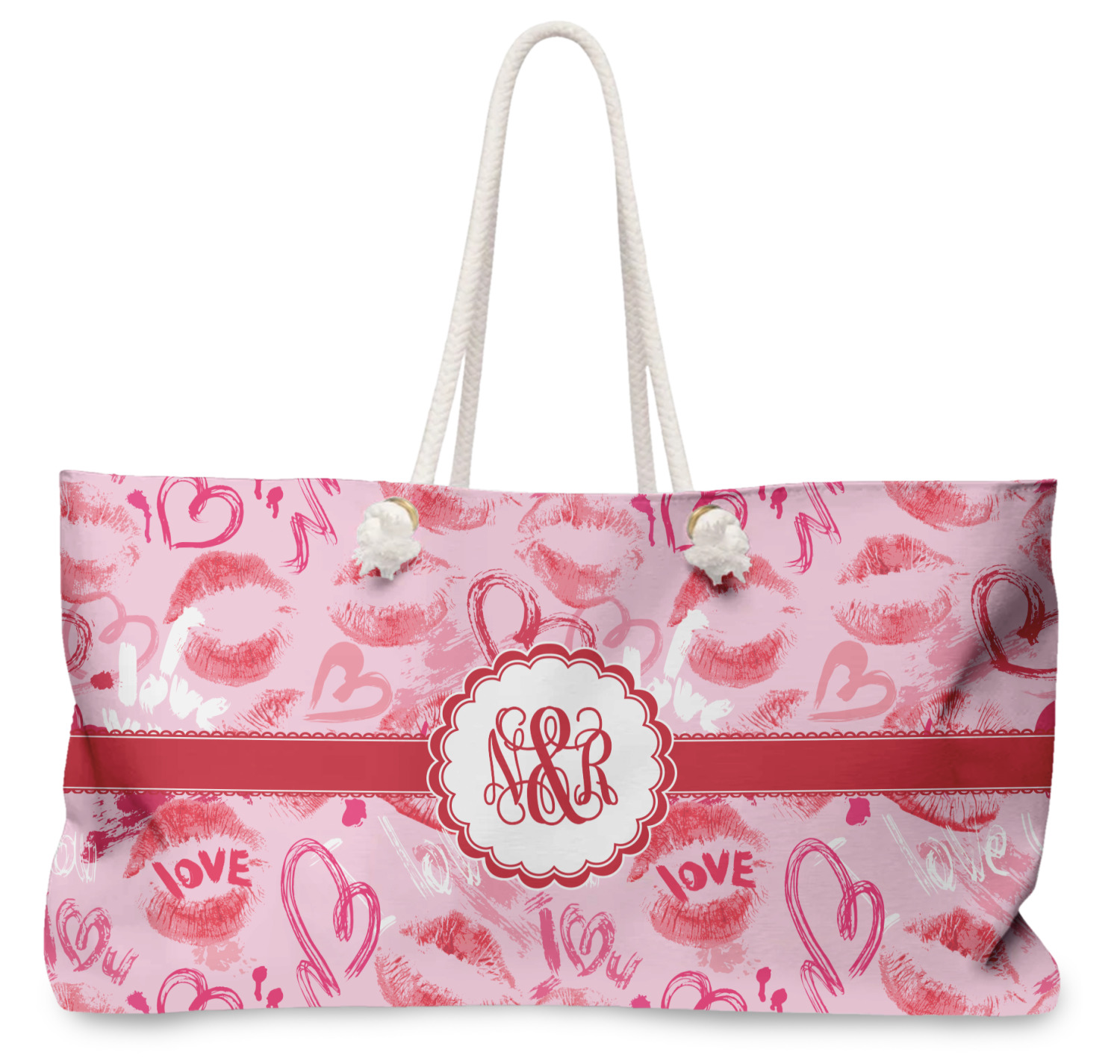 Our oversized weekender tote with rope handles is perfect for your weekend at the beach or on the town. This large tote are 24" W X 13" H, with a 5" gusset and a 27" thick rope handles with a knot that is put through a grommeted brass hole.