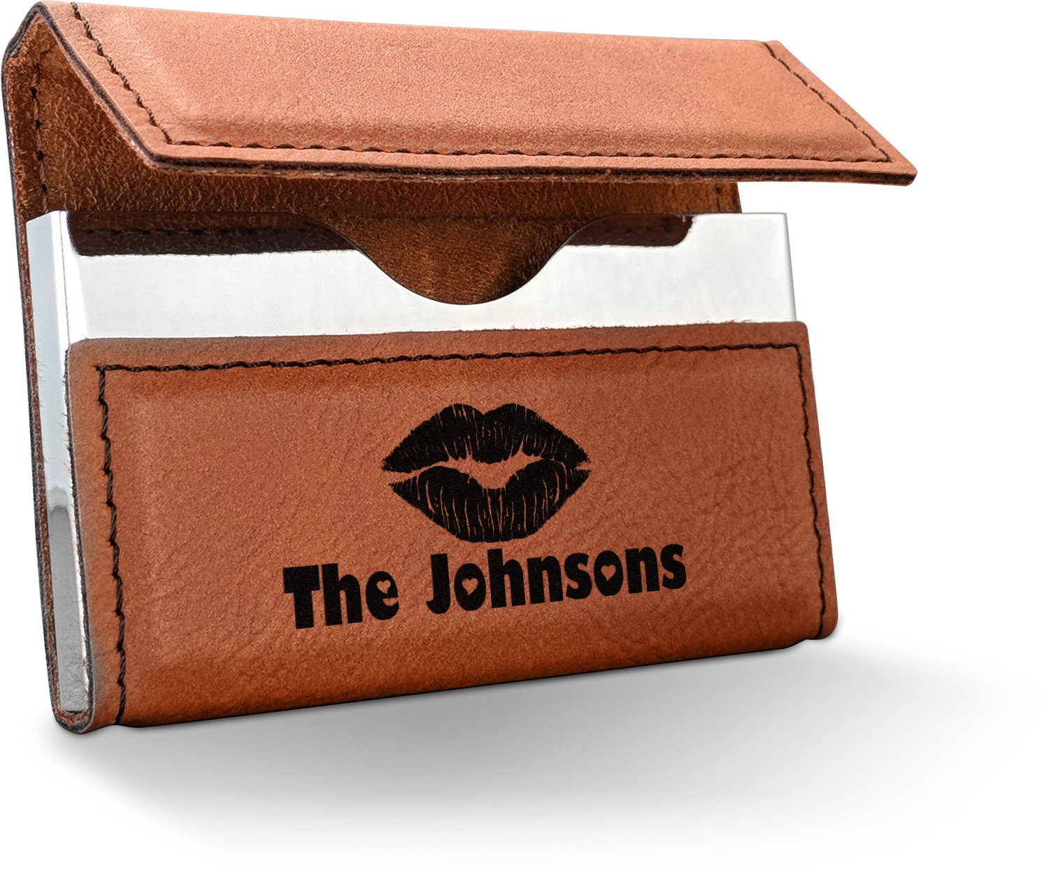 Your personalized design is laser engraved onto either the front, or the front and back of the card holder, depending on the model you purchase. Once engraved, the design will appear a darkened black against the cognac color of the leatherette.