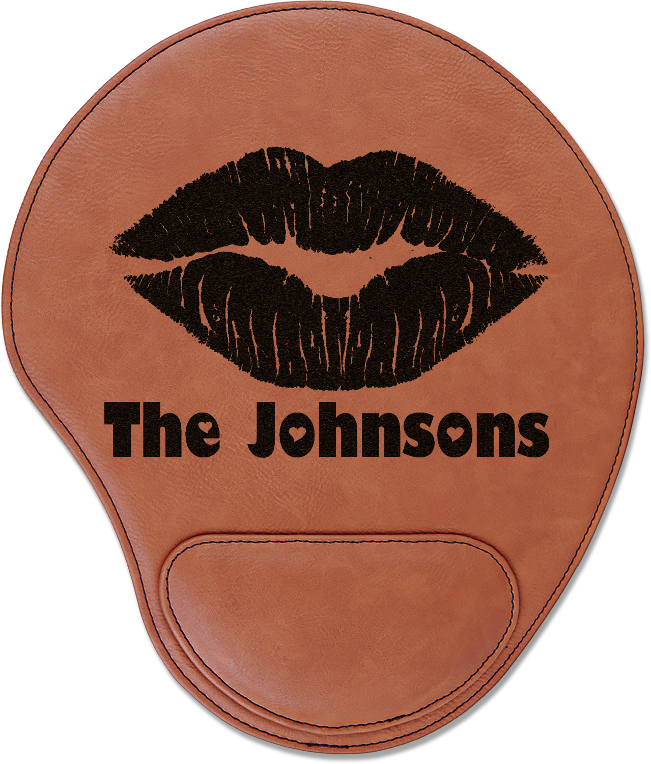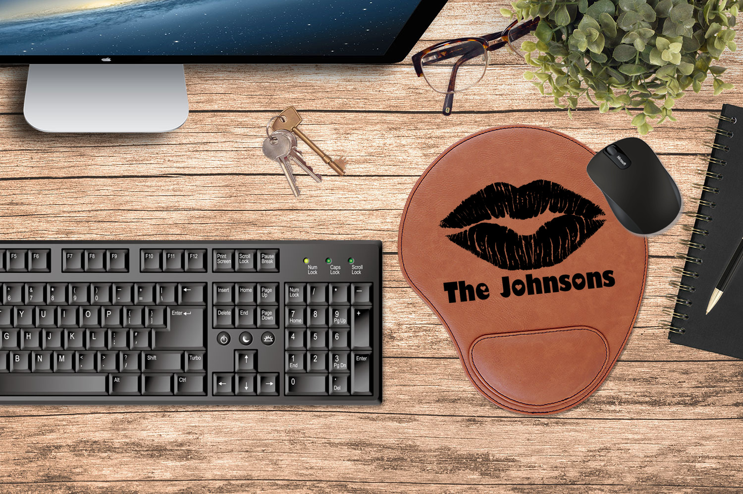 In a rounded shape, this mouse pad is made of a luxurious, cognac-colored leatherette. The nature of this material allows your mouse to glide smoothly across its surface. Strong stitching lines the edges to guarantee stability and strength. As added support for tired wrists, your personalized mouse pad features a supportive wrist rest at its bottom. This model measures at 10.25" x 9", while its wrist pad is approximately 5" x 2.75", with a thickness of 0.75". Your personalized design is laser engraved into the front face of this mouse pad.