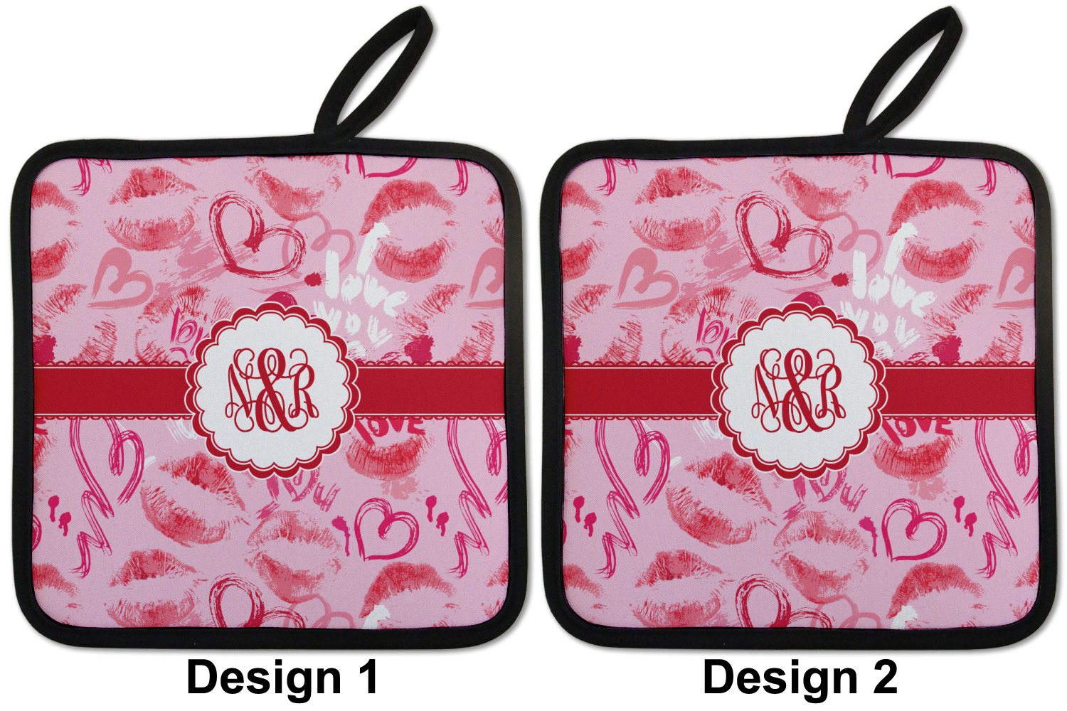 Our personalized pot holders feature a neoprene front that displays your personalization in vibrant colors. The backing of the hot pot holder is rubberized; the textured backing allows you to have a great grip when using this custom pot holder. The two materials are joined with a sleek, black trim, and the holder also includes an attached loop for hanging and storage. The pot holder is approximately 8.75 inches by 8.75 inches and 0.25 inches tall, while the fabric loop is 2.5 inches long. You can purchase a kitchen pot holder by itself or as a set of 2. We also offer a set including one pot holder and one oven mitt.