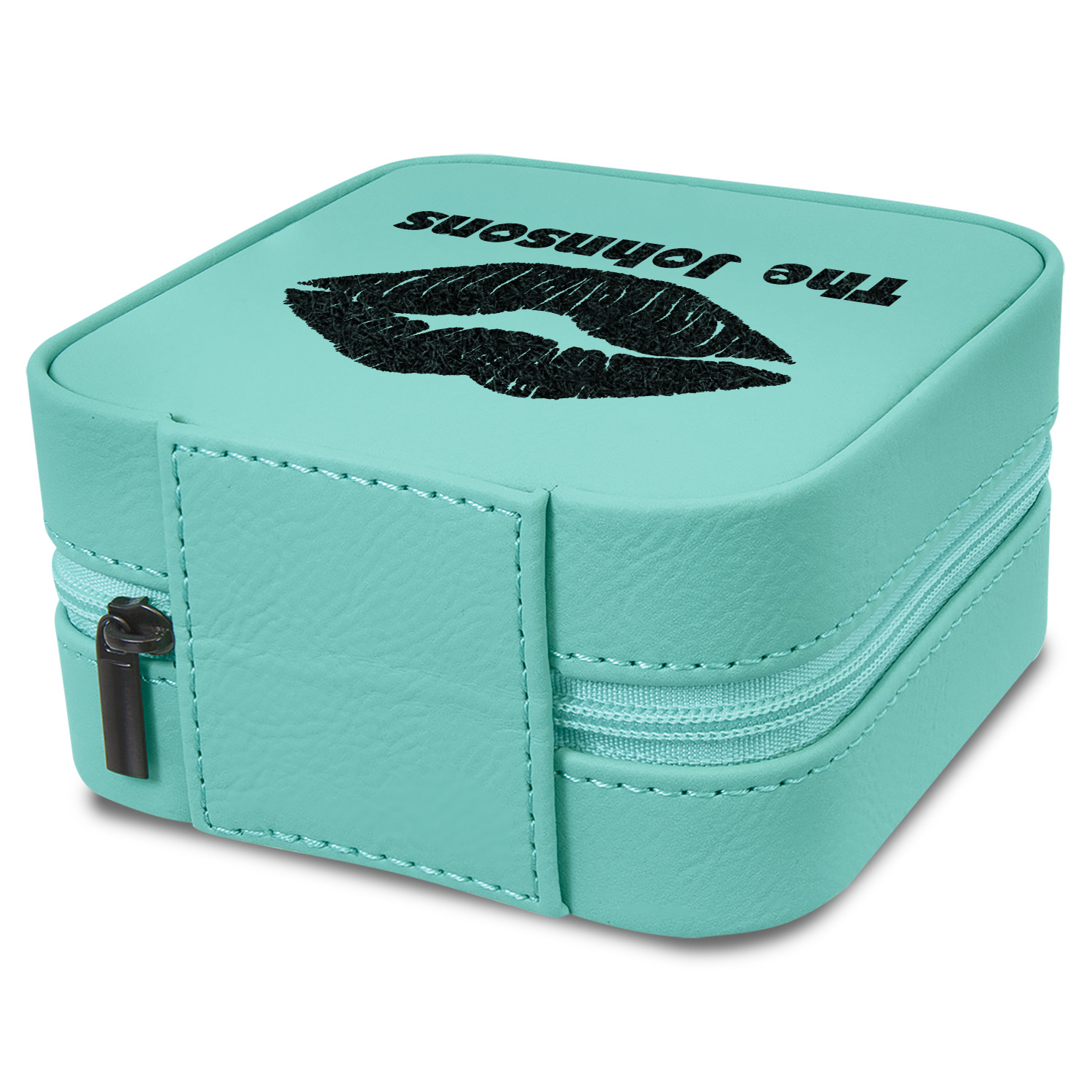 This square zippered travel jewelry box is made from leatherette and is available in four colors - classic cognac / rawhide, a beautiful teal. navy blue or pink. The tan colored soft velvet inside has compartments and hooks for all your jewelry - rings, chains, earrings, bangles etc.