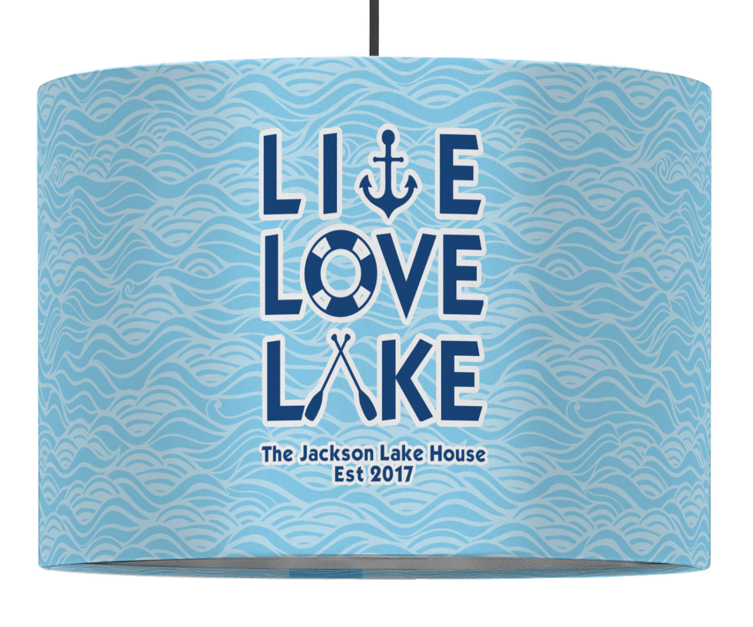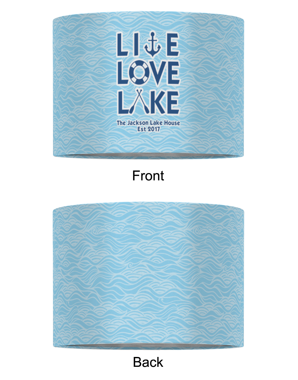 This design has a beautiful background with abstract waves that are a calming light blue. The main feature of this design is the quote. The quote used for this design says "Live Love Lake," but remember that we have many other lake house quotes to choose from. Underneath the quote you are able to put your personalization!