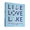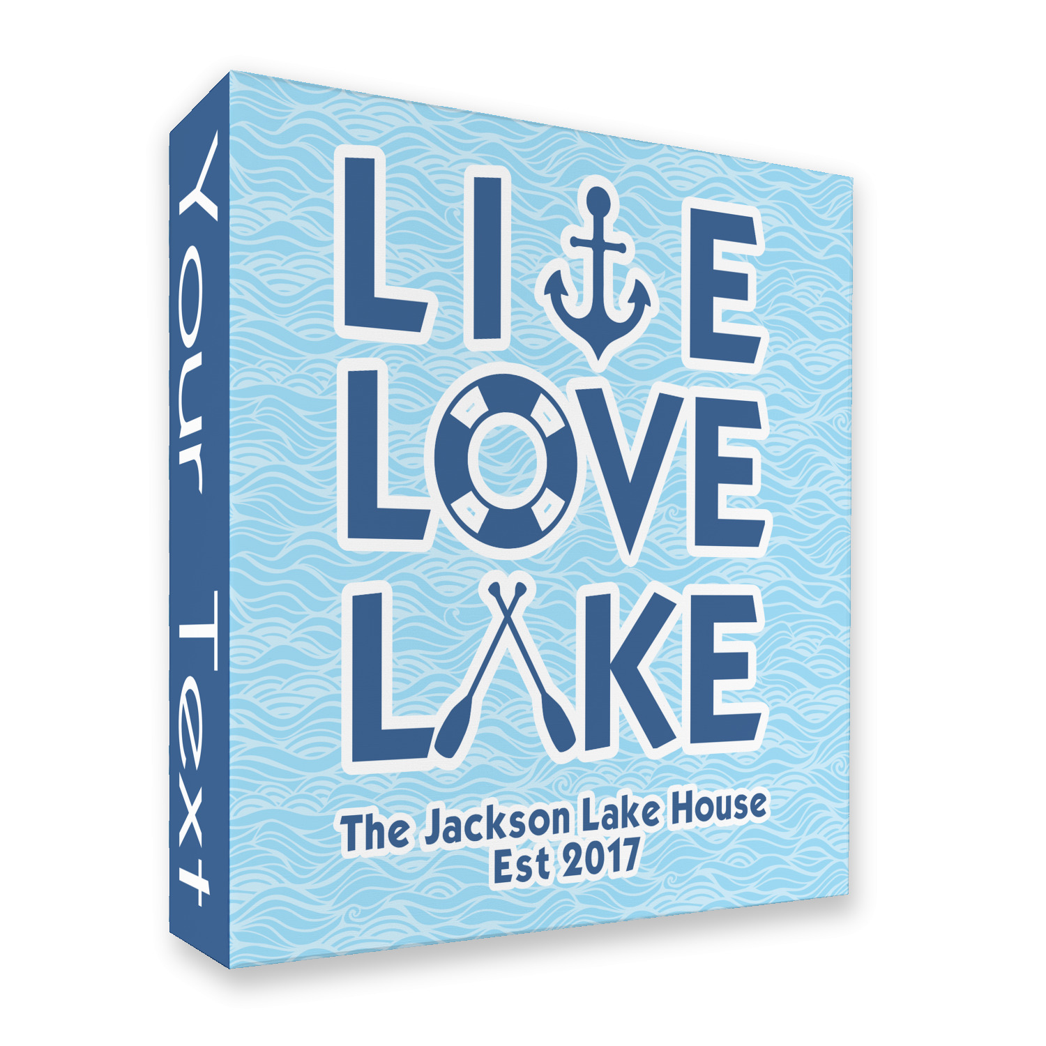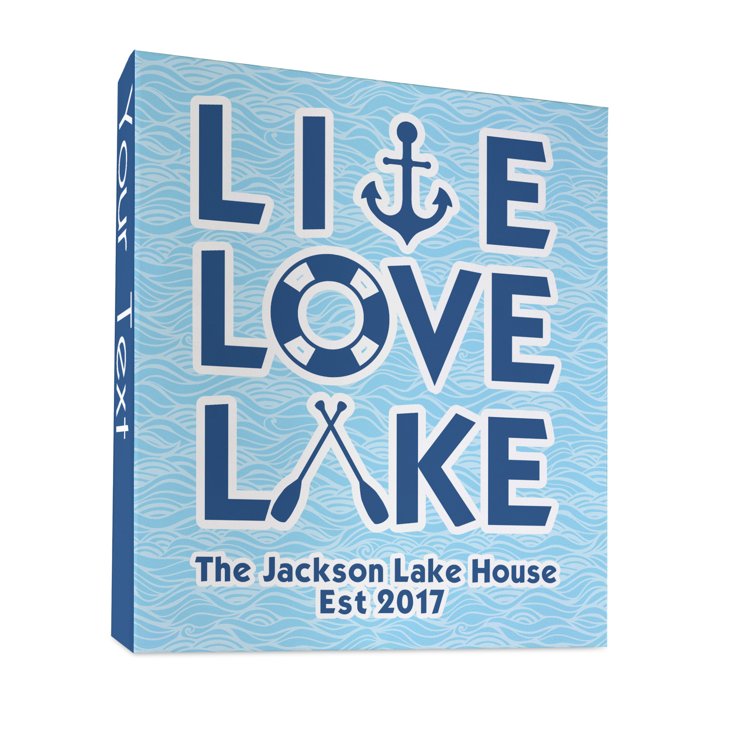 This design has a beautiful background with abstract waves that are a calming light blue. The main feature of this design is the quote. The quote used for this design says "Live Love Lake," but remember that we have many other lake house quotes to choose from. Underneath the quote you are able to put your personalization!
