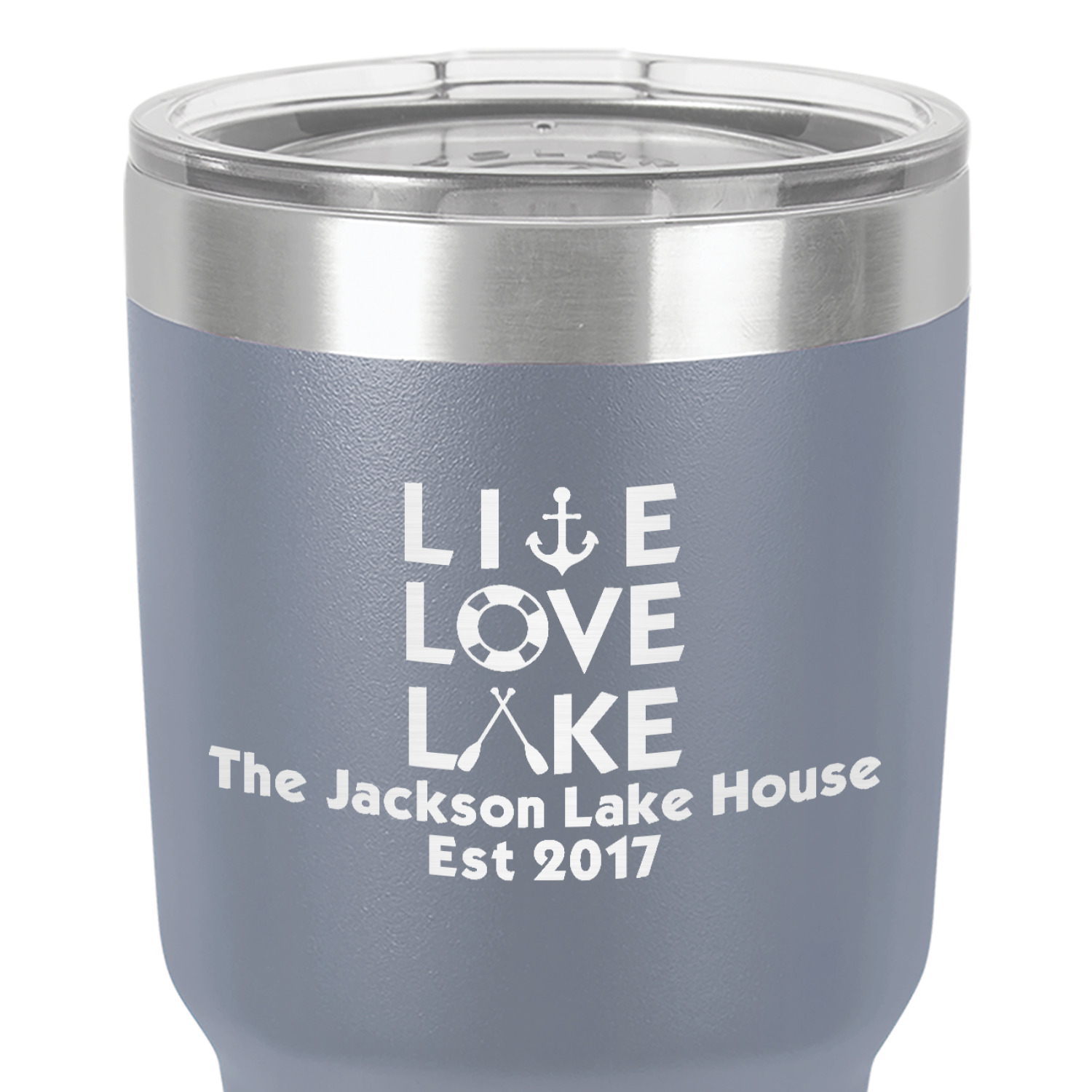 This design has a beautiful background with abstract waves that are a calming light blue. The main feature of this design is the quote. The quote used for this design says "Live Love Lake," but remember that we have many other lake house quotes to choose from. Underneath the quote you are able to put your personalization!