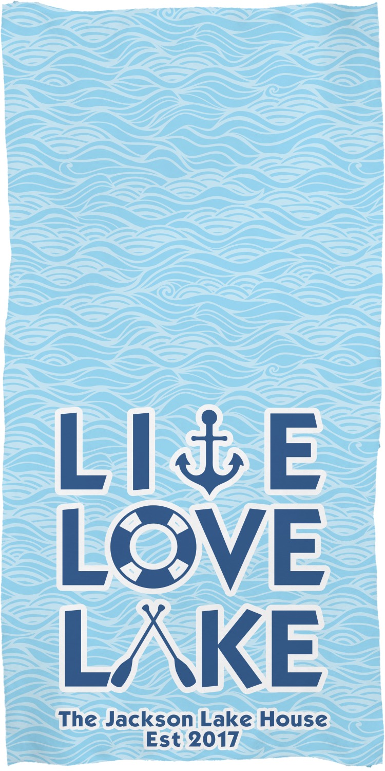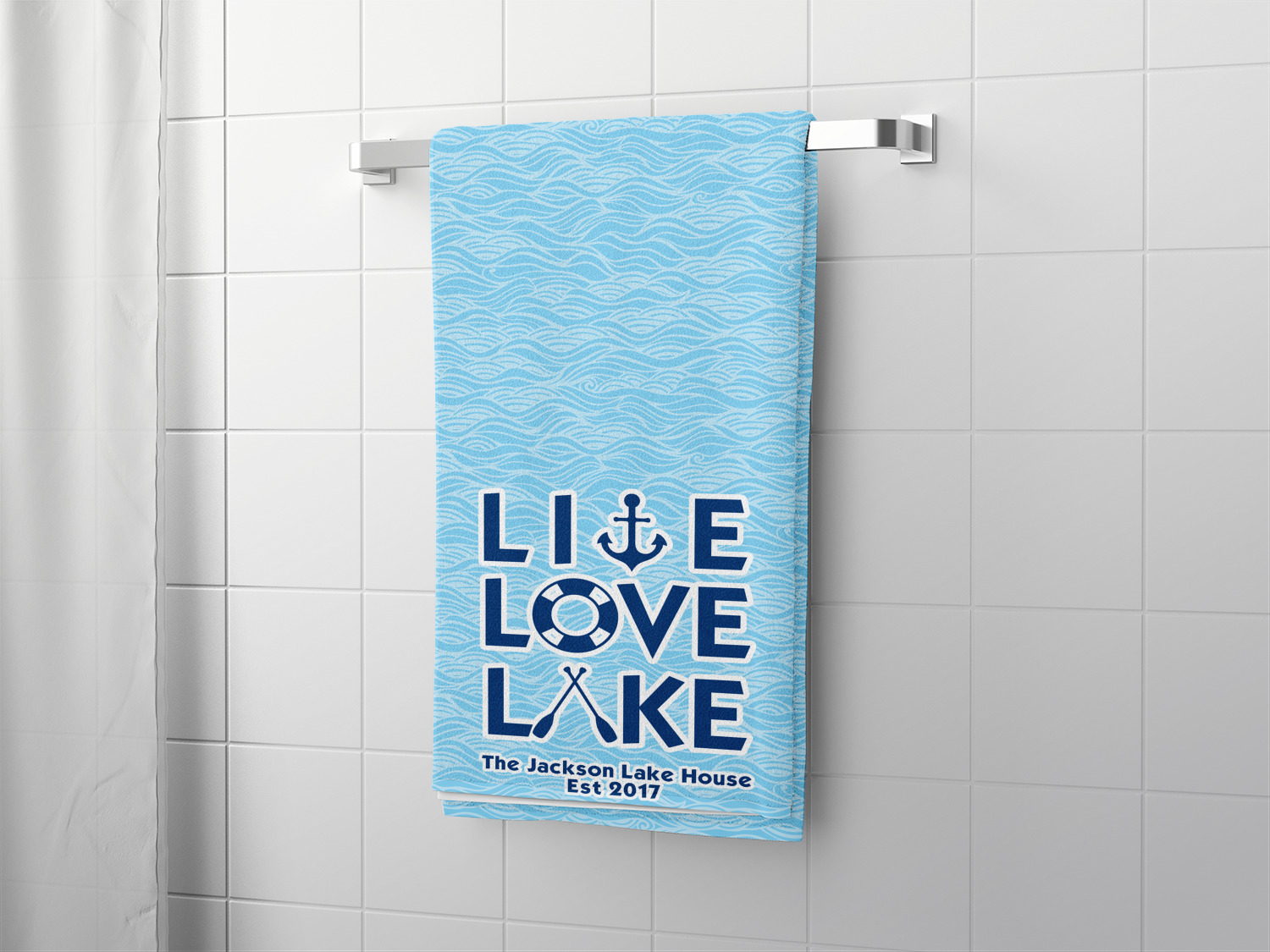 This design has a beautiful background with abstract waves that are a calming light blue. The main feature of this design is the quote. The quote used for this design says "Live Love Lake," but remember that we have many other lake house quotes to choose from. Underneath the quote you are able to put your personalization!
