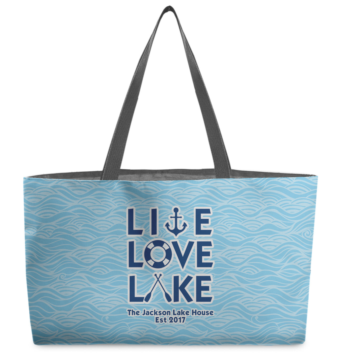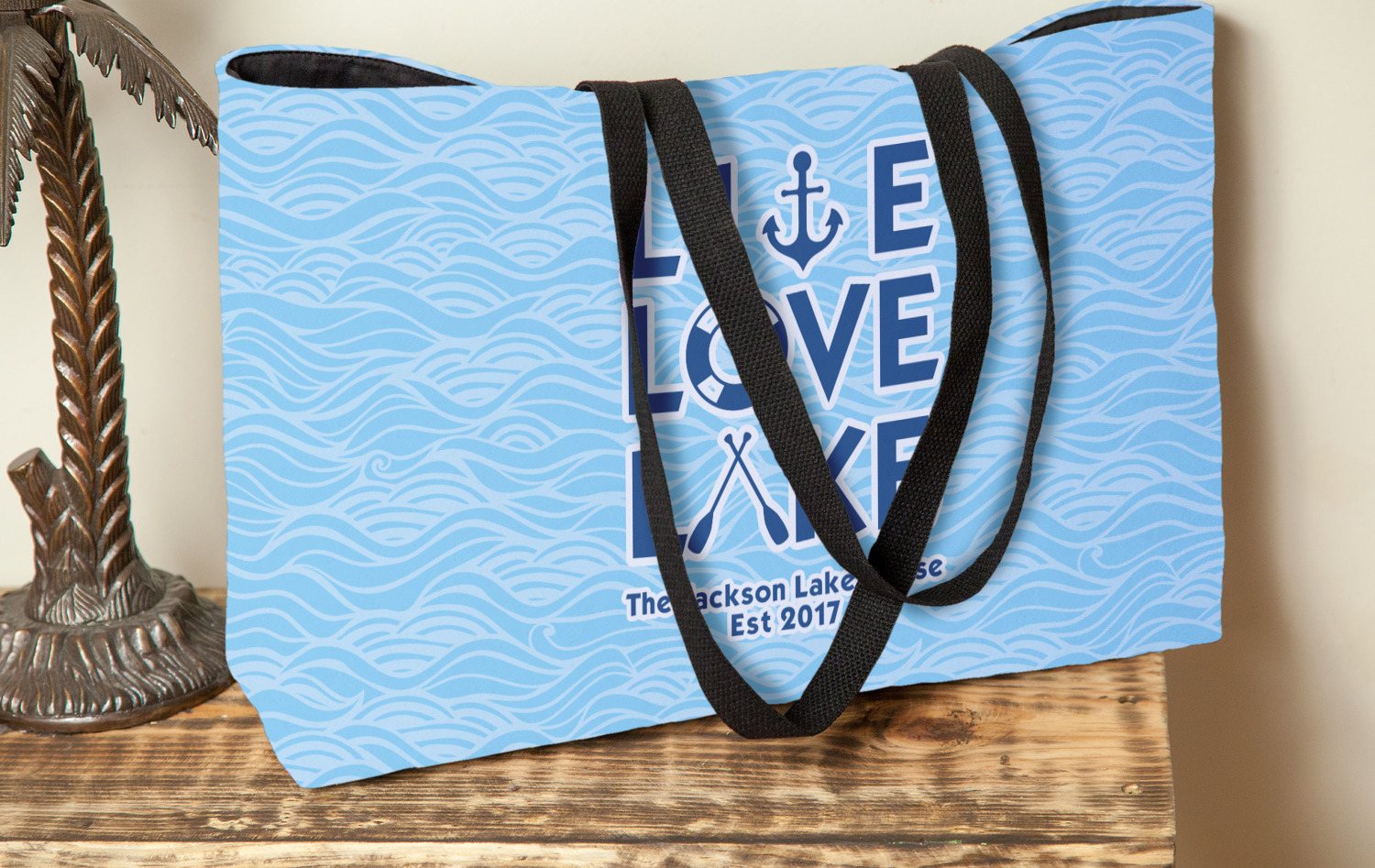 This design has a beautiful background with abstract waves that are a calming light blue. The main feature of this design is the quote. The quote used for this design says "Live Love Lake," but remember that we have many other lake house quotes to choose from. Underneath the quote you are able to put your personalization!