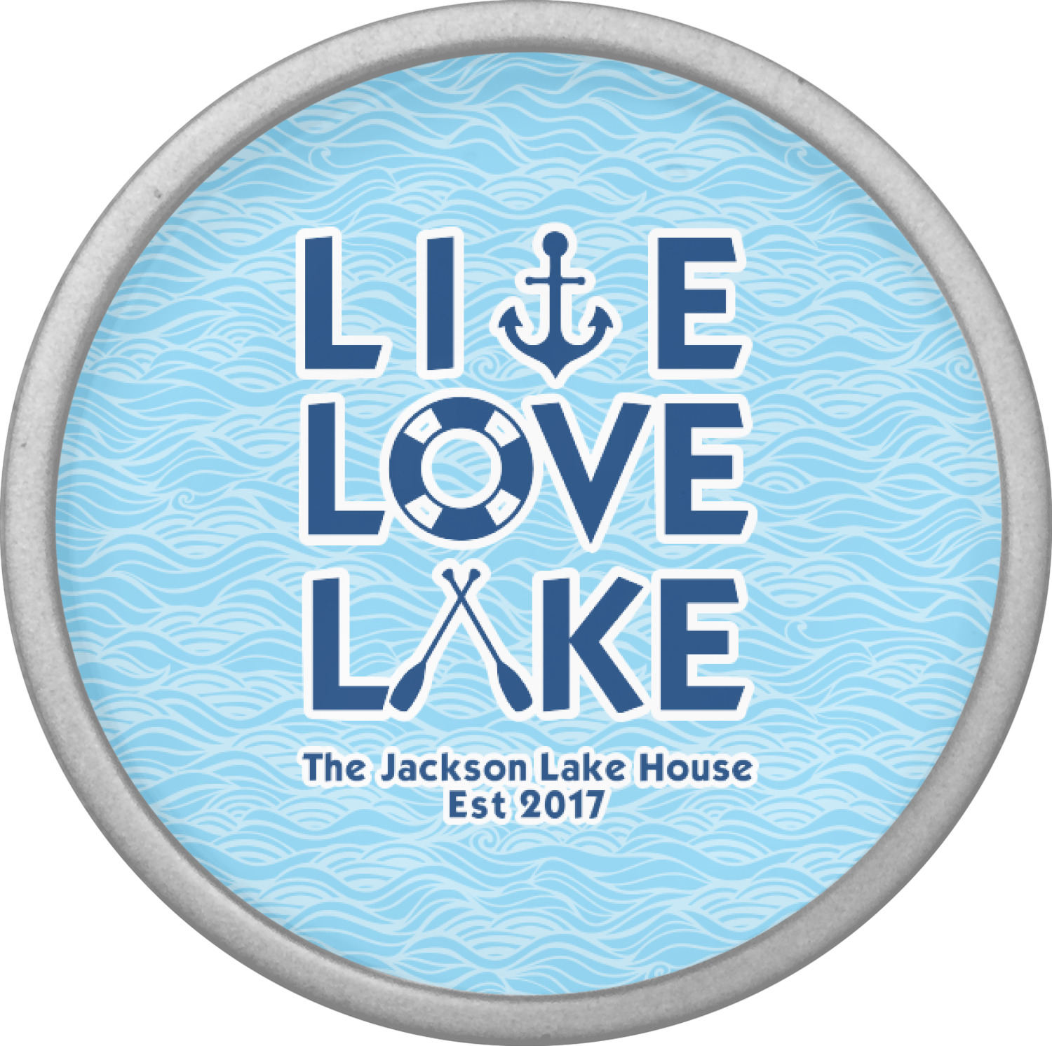 This design has a beautiful background with abstract waves that are a calming light blue. The main feature of this design is the quote. The quote used for this design says "Live Love Lake," but remember that we have many other lake house quotes to choose from. Underneath the quote you are able to put your personalization!