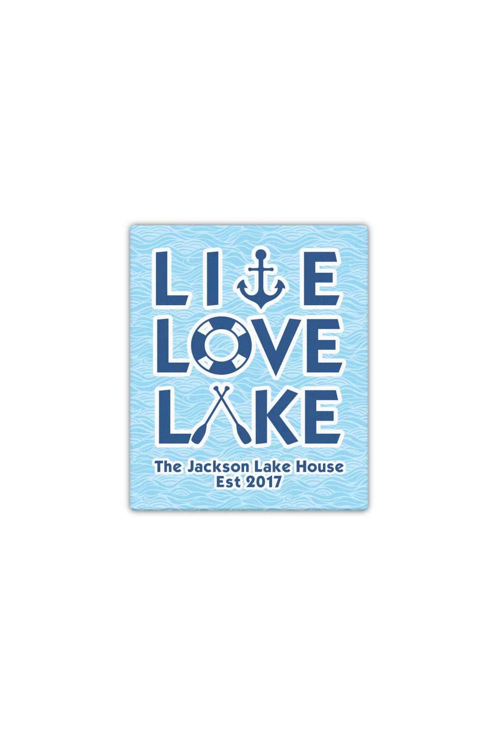 This design has a beautiful background with abstract waves that are a calming light blue. The main feature of this design is the quote. The quote used for this design says "Live Love Lake," but remember that we have many other lake house quotes to choose from. Underneath the quote you are able to put your personalization!