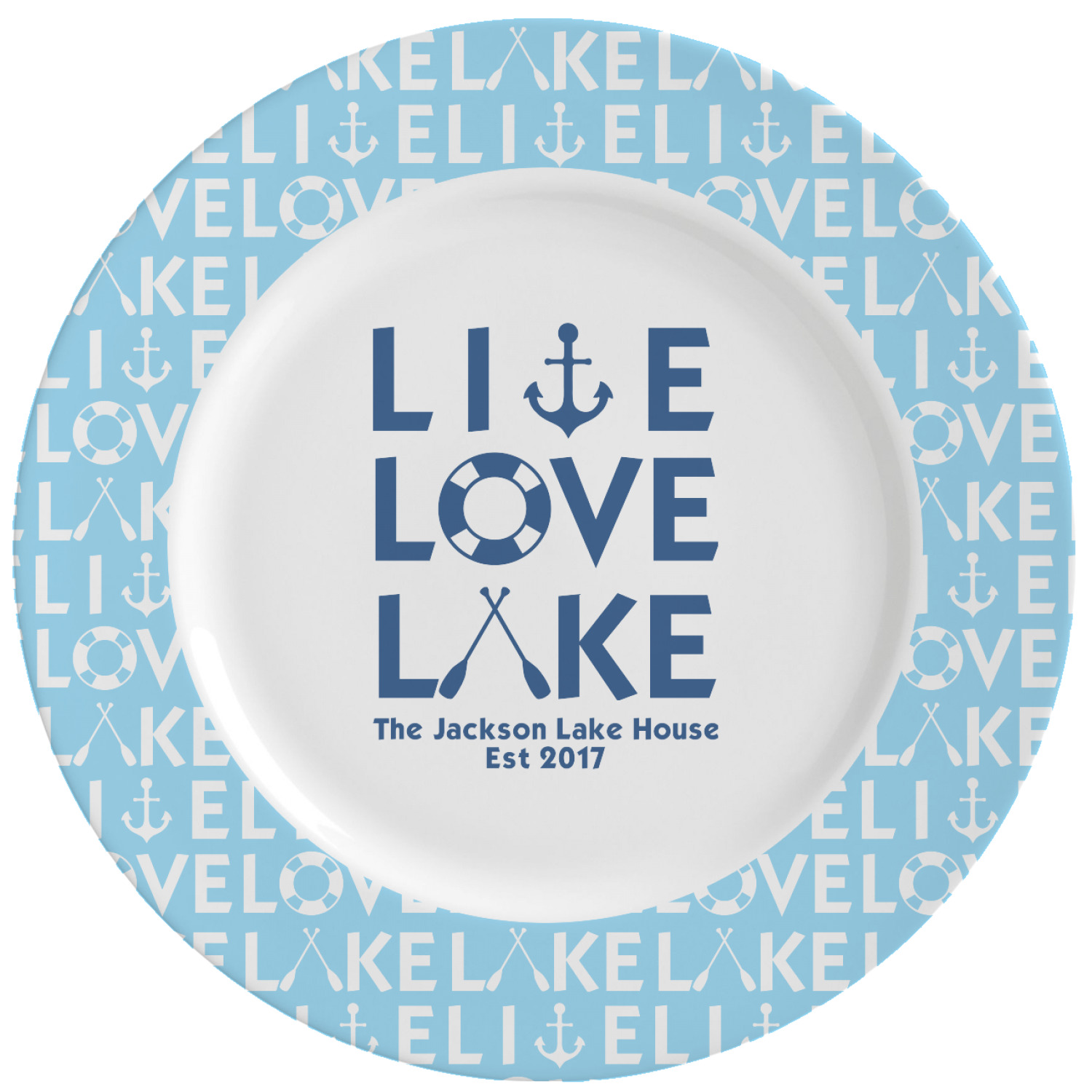 This design has a beautiful background with abstract waves that are a calming light blue. The main feature of this design is the quote. The quote used for this design says "Live Love Lake," but remember that we have many other lake house quotes to choose from. Underneath the quote you are able to put your personalization!