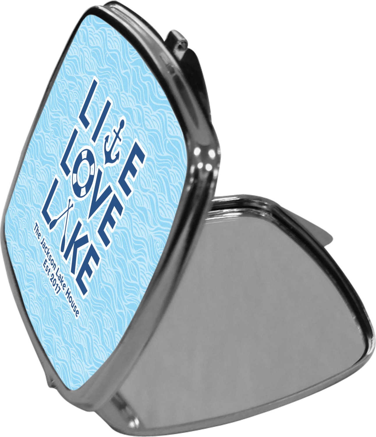 Our compact mirrors are customized with your design on one side. The other side is patterned silver tone metal. Inside, there are two mirrors.