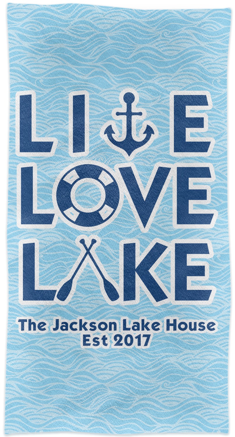 This design has a beautiful background with abstract waves that are a calming light blue. The main feature of this design is the quote. The quote used for this design says "Live Love Lake," but remember that we have many other lake house quotes to choose from. Underneath the quote you are able to put your personalization!