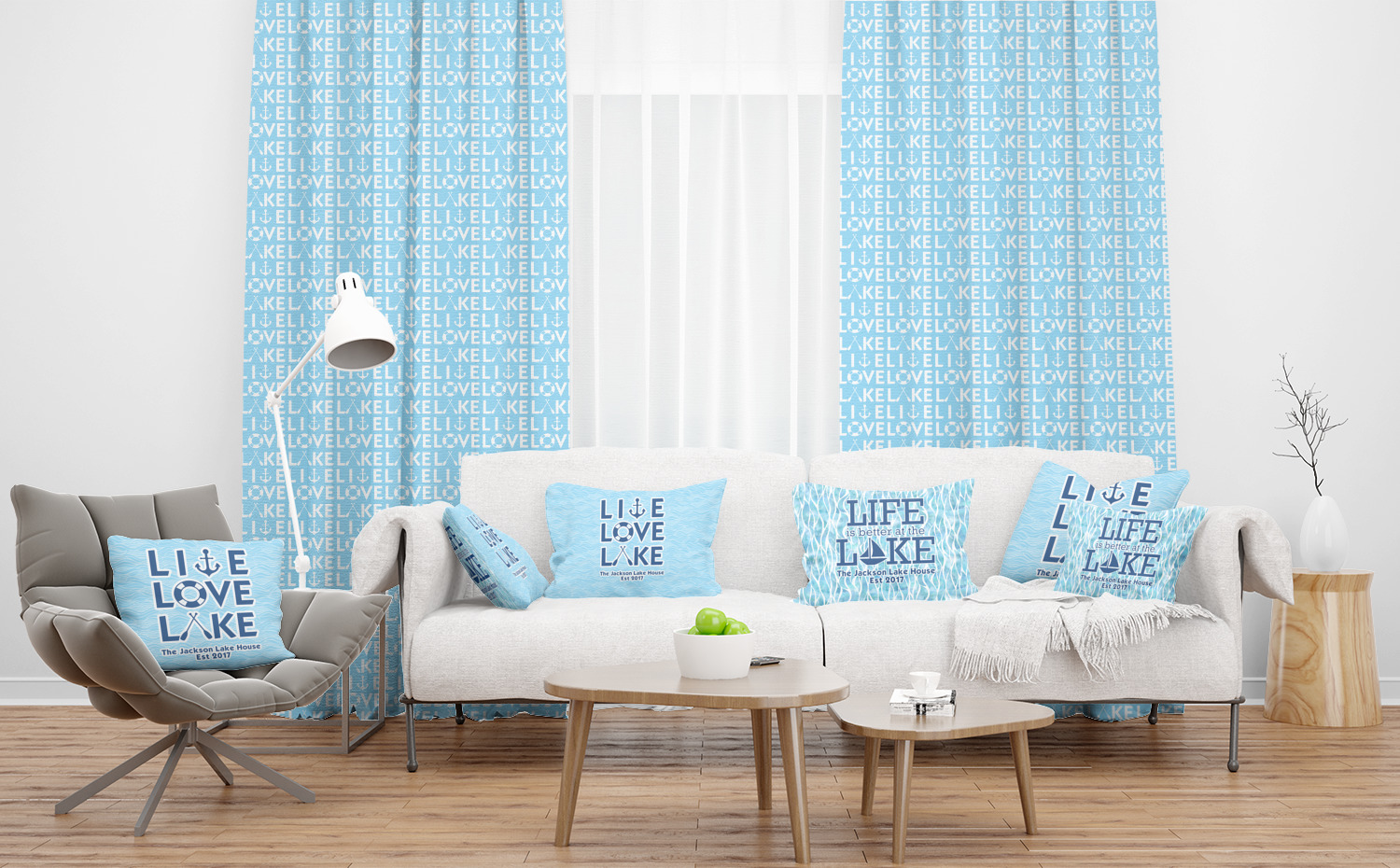 This design has a beautiful background with abstract waves that are a calming light blue. The main feature of this design is the quote. The quote used for this design says "Live Love Lake," but remember that we have many other lake house quotes to choose from. Underneath the quote you are able to put your personalization!