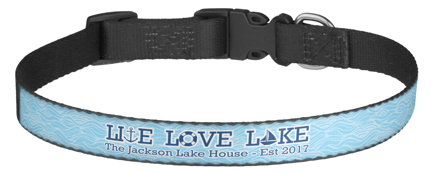 This sturdy collar, made from a durable nylon weave, will outlive your dog's episodes of excited tugging and pulling. Courtesy of its thick plastic buckle and adjuster, this collar is adjustable and accommodating of any dog. Structurally, the collar is a single piece of nylon weave that is sewn together, and features a solid metal loop where you can attach a leash or dog tag. We print and display your dog's name and pattern across the middle of the personalized dog collar.