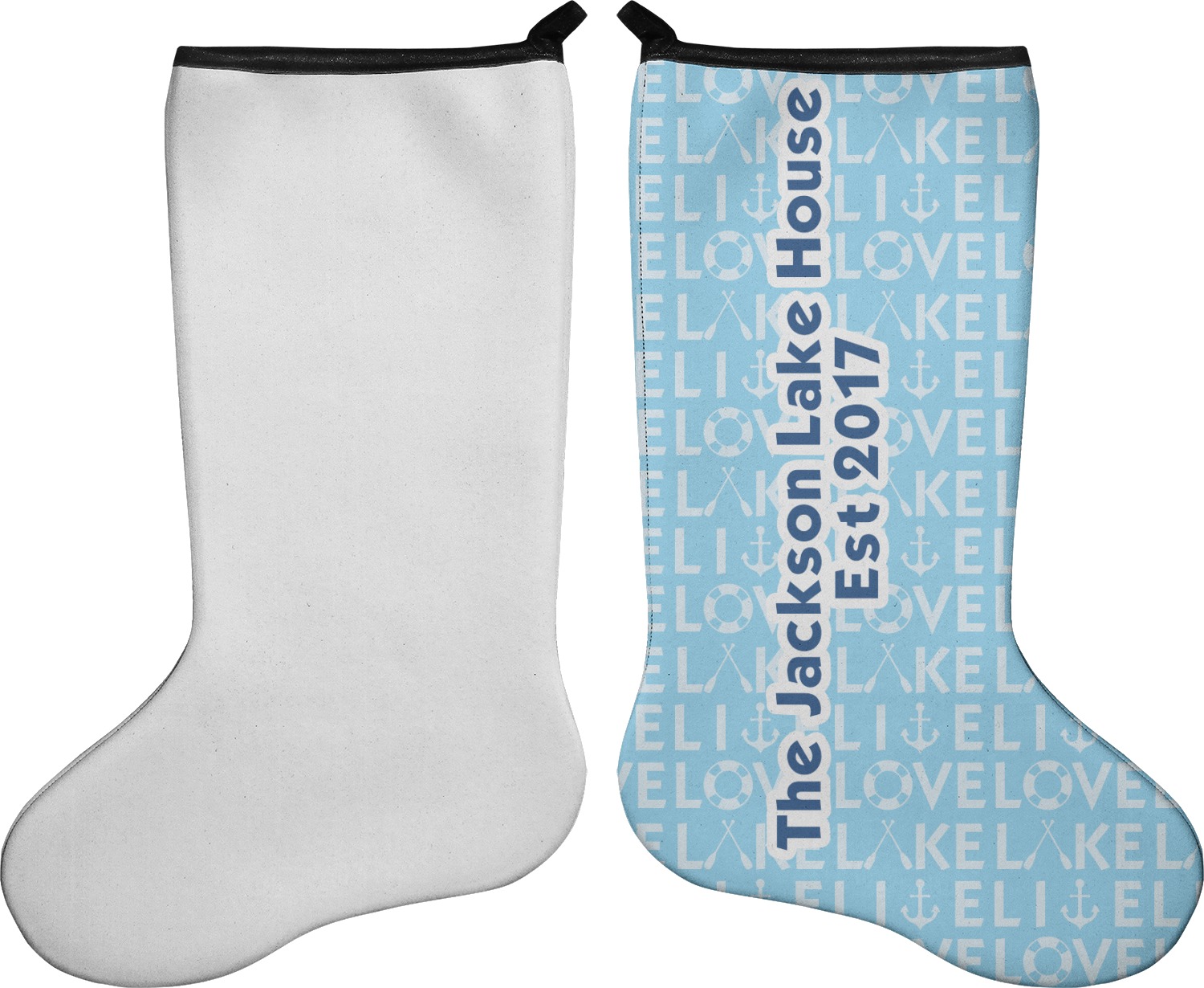 These 17" x 11" stockings are made of neoprene and have a black trim to give them a fantastic finished look. Your very own design is printed right onto the stocking, either single sided with white on the back or double sided where can use the same or different designs / patterns on the front and the back - the choice is yours. At the top of the stocking is a 2" loop for hanging.