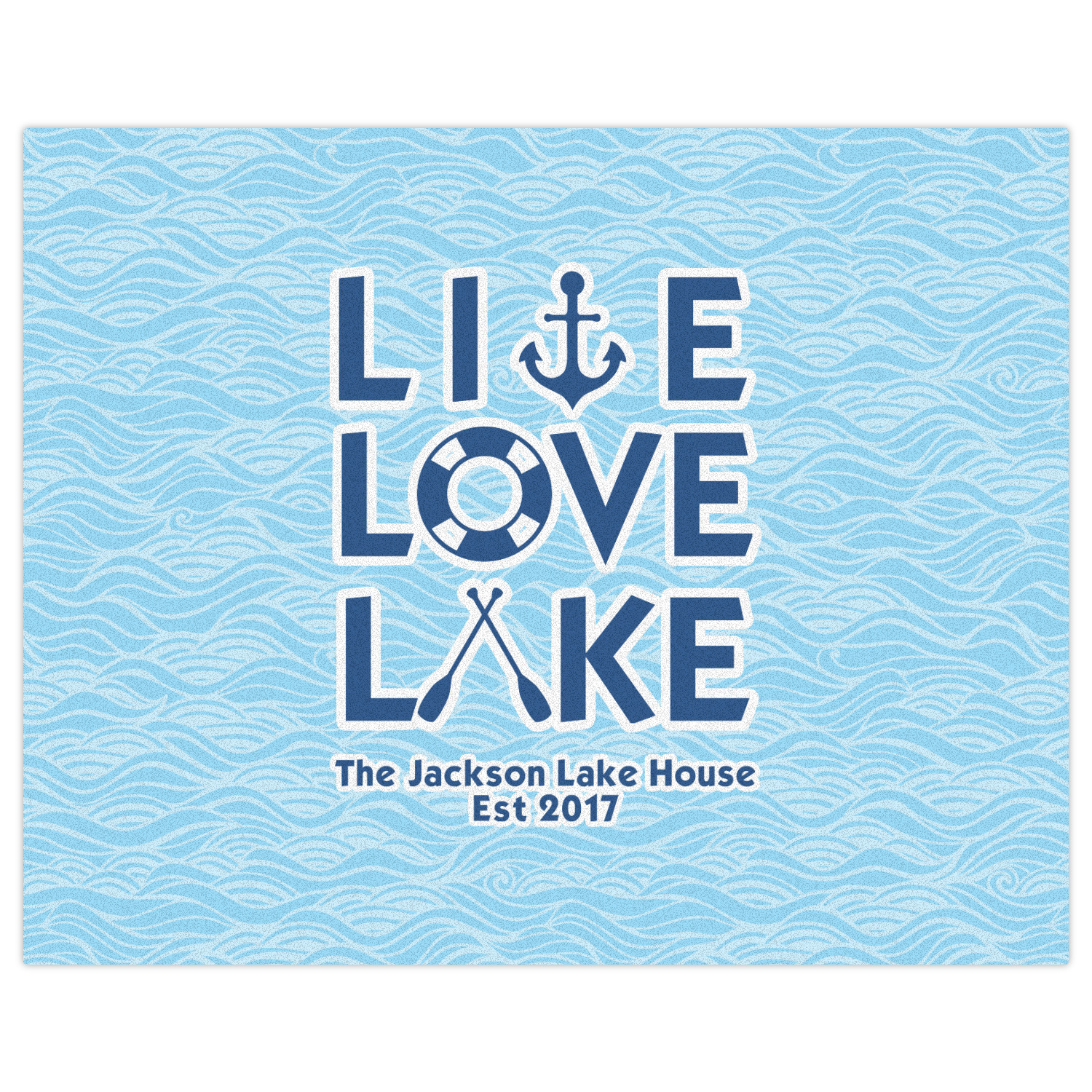 This design has a beautiful background with abstract waves that are a calming light blue. The main feature of this design is the quote. The quote used for this design says "Live Love Lake," but remember that we have many other lake house quotes to choose from. Underneath the quote you are able to put your personalization!