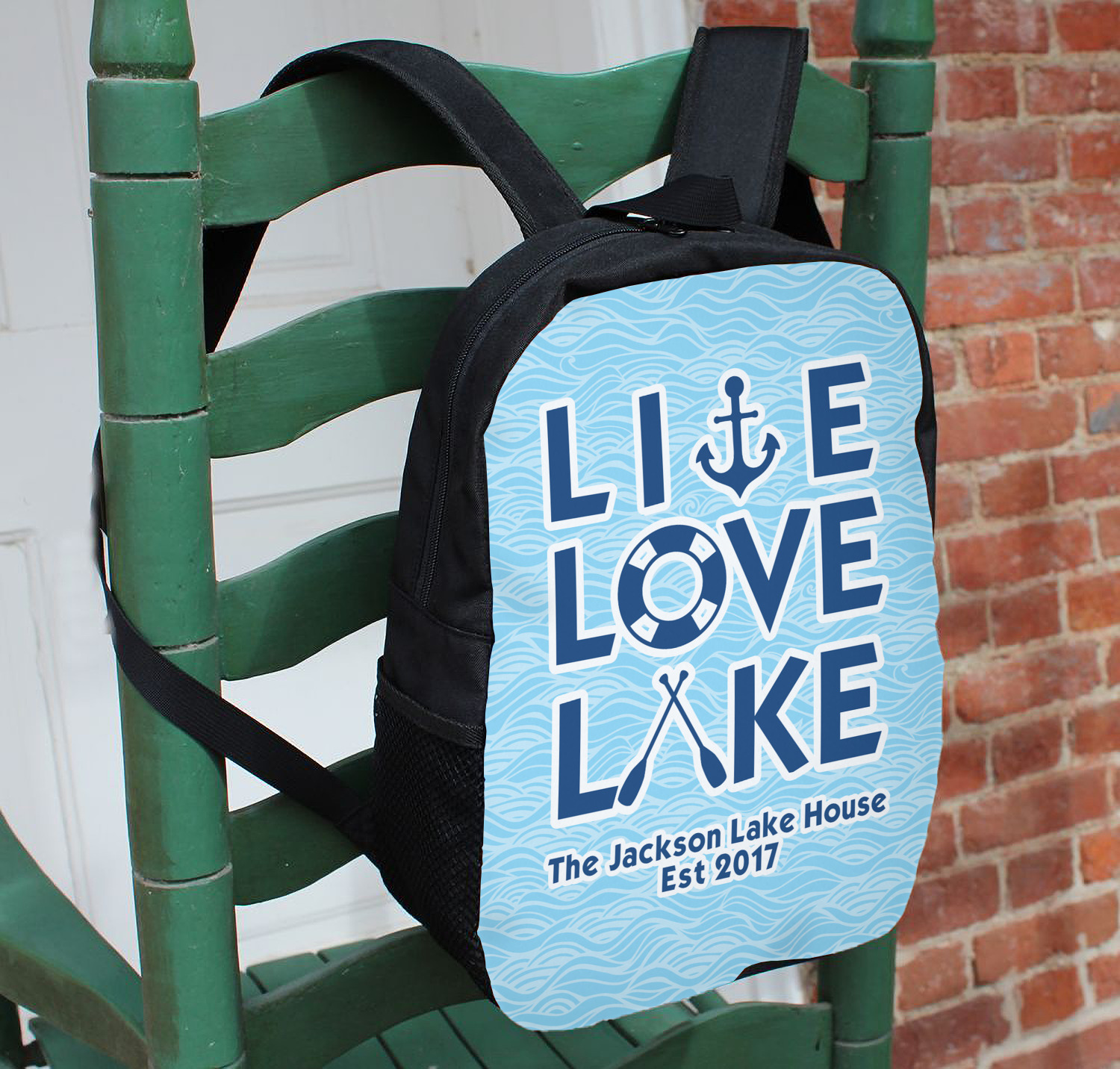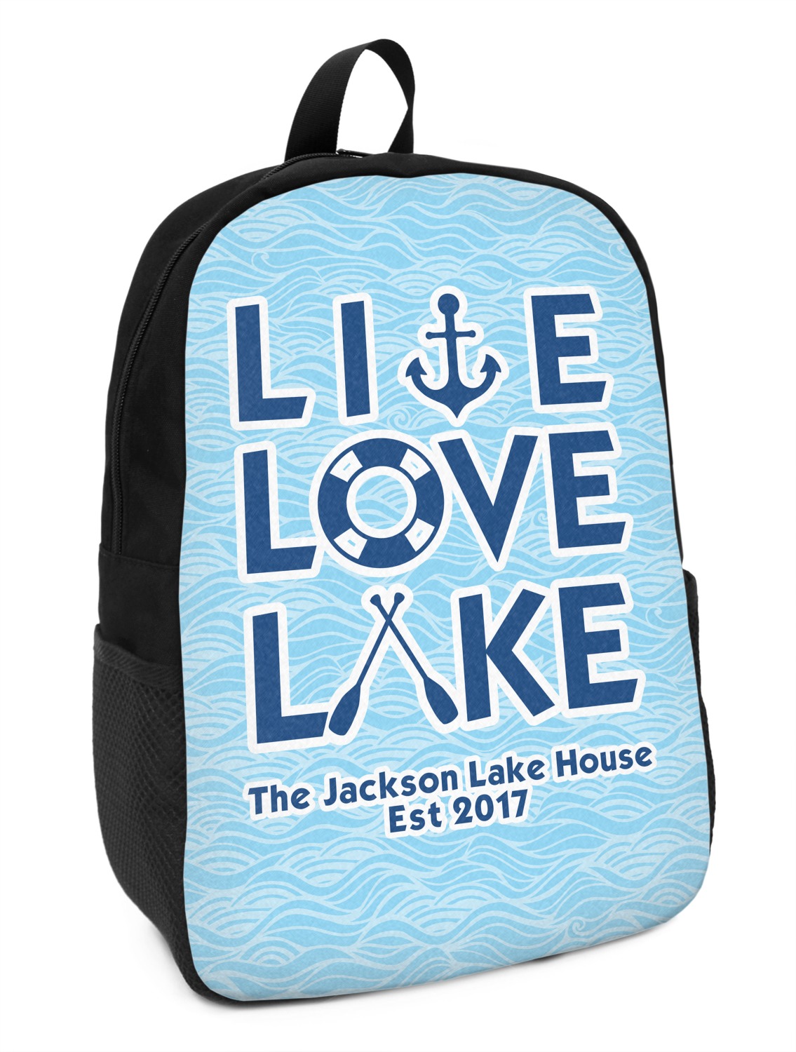 This design has a beautiful background with abstract waves that are a calming light blue. The main feature of this design is the quote. The quote used for this design says "Live Love Lake," but remember that we have many other lake house quotes to choose from. Underneath the quote you are able to put your personalization!