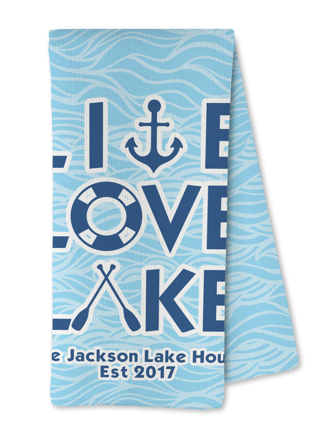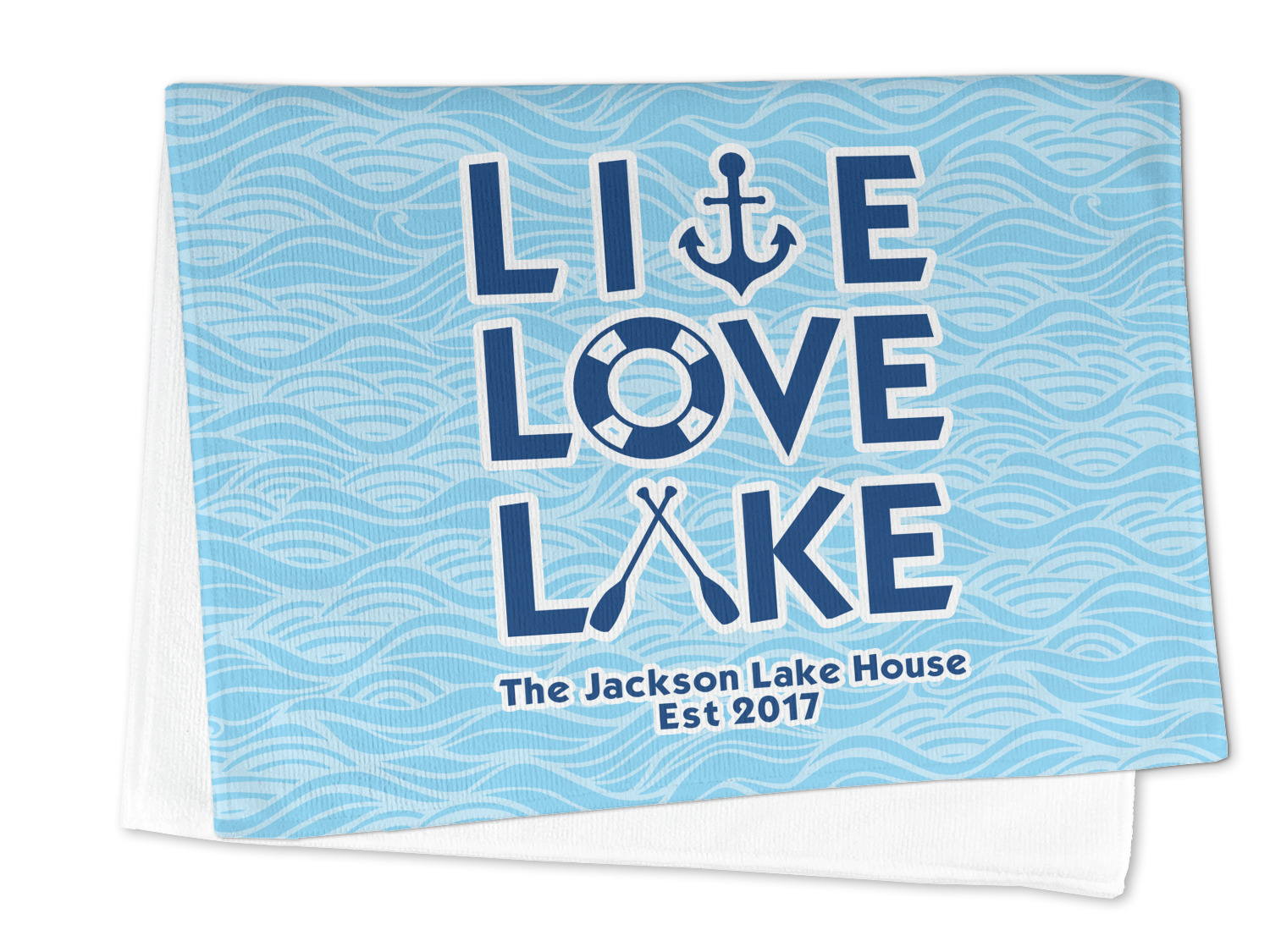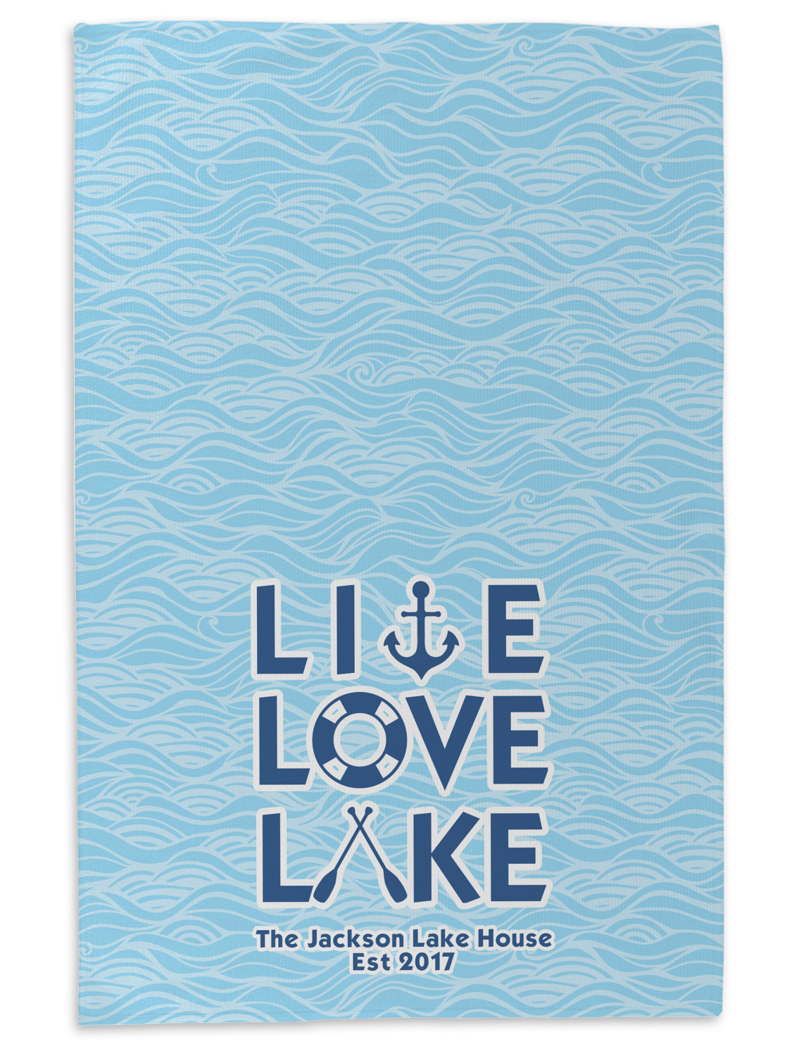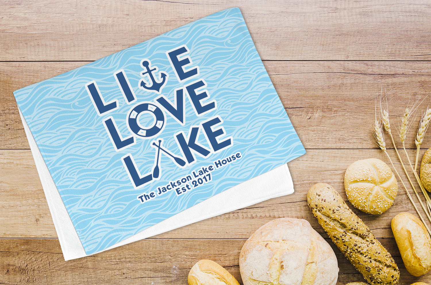 This design has a beautiful background with abstract waves that are a calming light blue. The main feature of this design is the quote. The quote used for this design says "Live Love Lake," but remember that we have many other lake house quotes to choose from. Underneath the quote you are able to put your personalization!