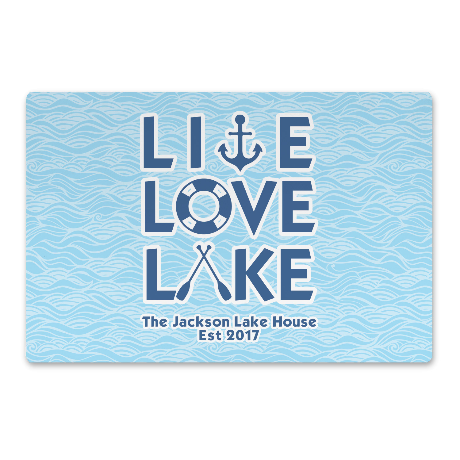 This design has a beautiful background with abstract waves that are a calming light blue. The main feature of this design is the quote. The quote used for this design says "Live Love Lake," but remember that we have many other lake house quotes to choose from. Underneath the quote you are able to put your personalization!
