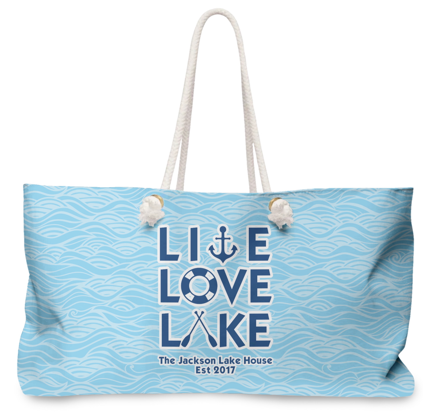 This design has a beautiful background with abstract waves that are a calming light blue. The main feature of this design is the quote. The quote used for this design says "Live Love Lake," but remember that we have many other lake house quotes to choose from. Underneath the quote you are able to put your personalization!