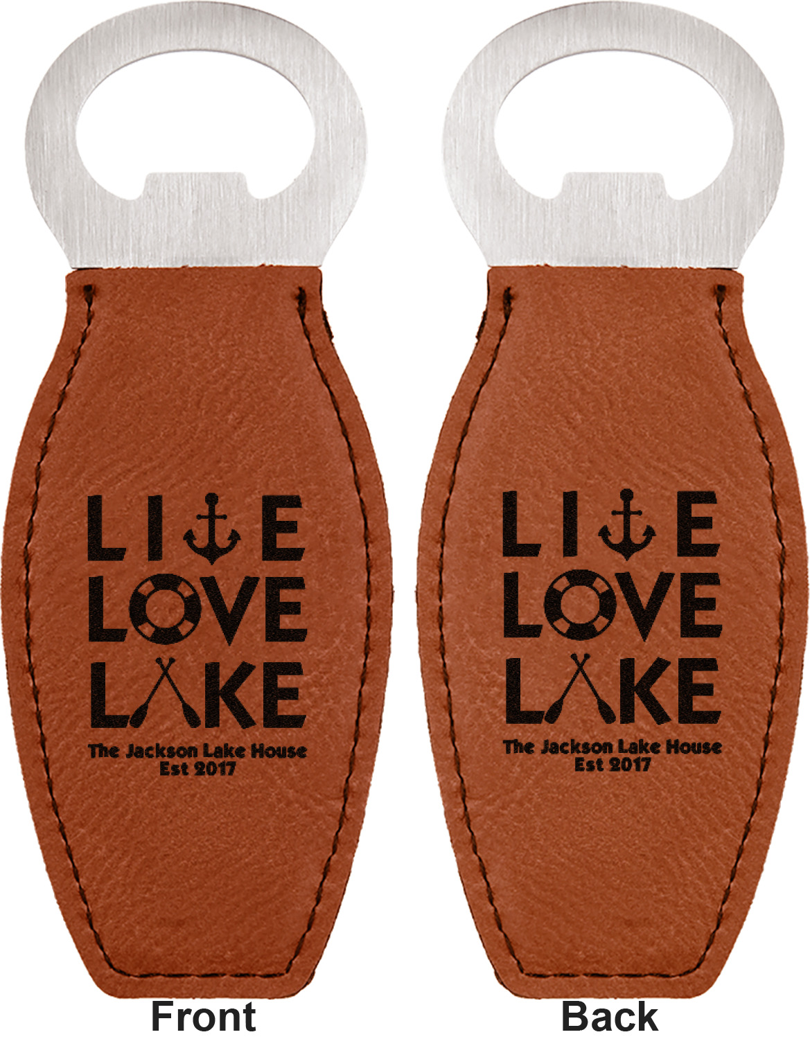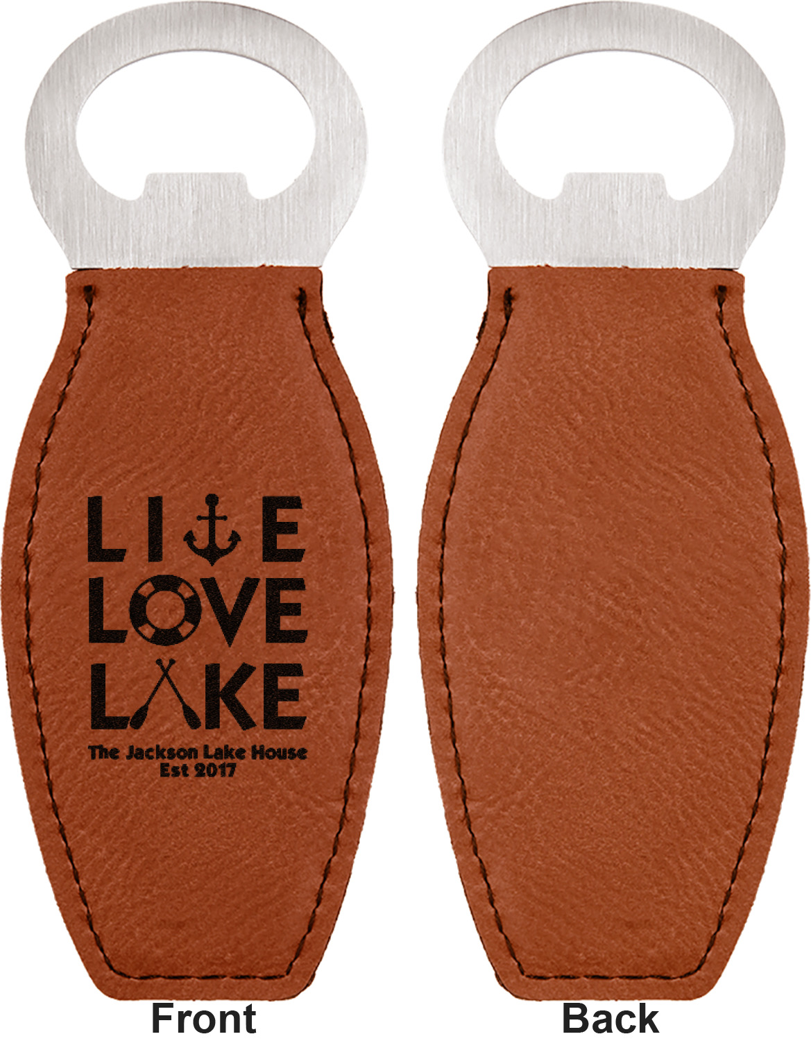 Built from stainless steel, these custom bottle openers are wrapped in a cognac-colored leatherette. Sharp, black stitching lines the edges for extra durability and a finished touch. Your personalization is laser-engraved onto the surface of this leatherette, leaving behind a crisp, black coloration. At 4.6 by 1.8 inches, this beer bottle opener gives you much of leverage when trying to open a stubborn bottle. On the opposite end of the opener, you'll find a magnet that you can use to display your new, unique bottle opener!