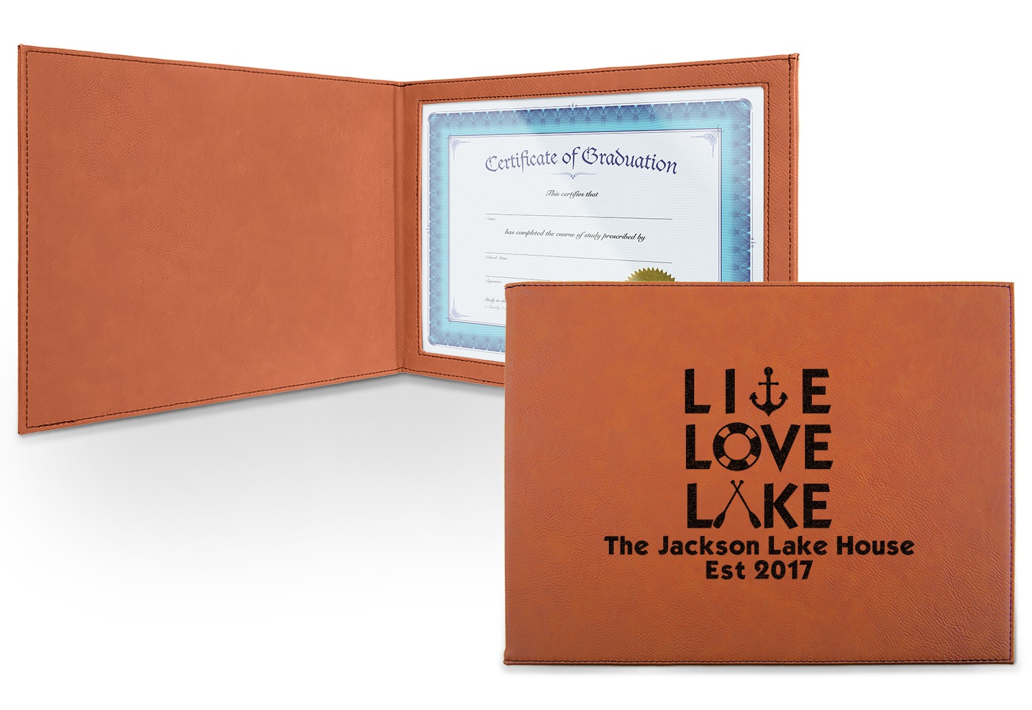 This cognac-colored, leatherette certificate jacket is the ideal way to display or store your hard-earned certificate. When closed, the custom certificate holder measures at 12 by 9 inches. The interior of the certificate cover includes a clear, vinyl window to encase your diploma. The window measures at around 10.5 by 7.5 inches and can accommodate a diploma that measures at up to 8.5 by 11 inches. You can either choose to have your customization laser engraved on the front and interior, or solely the front.