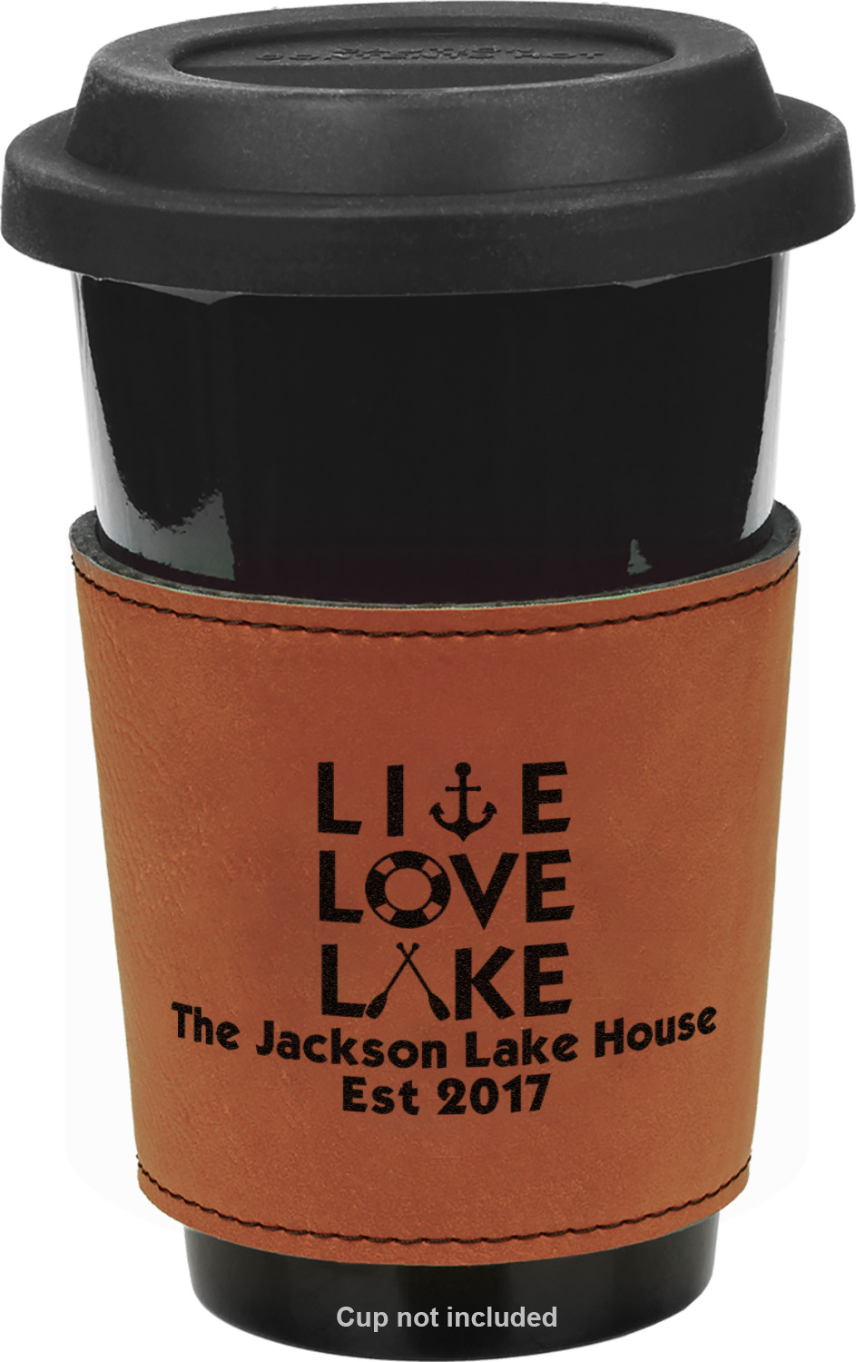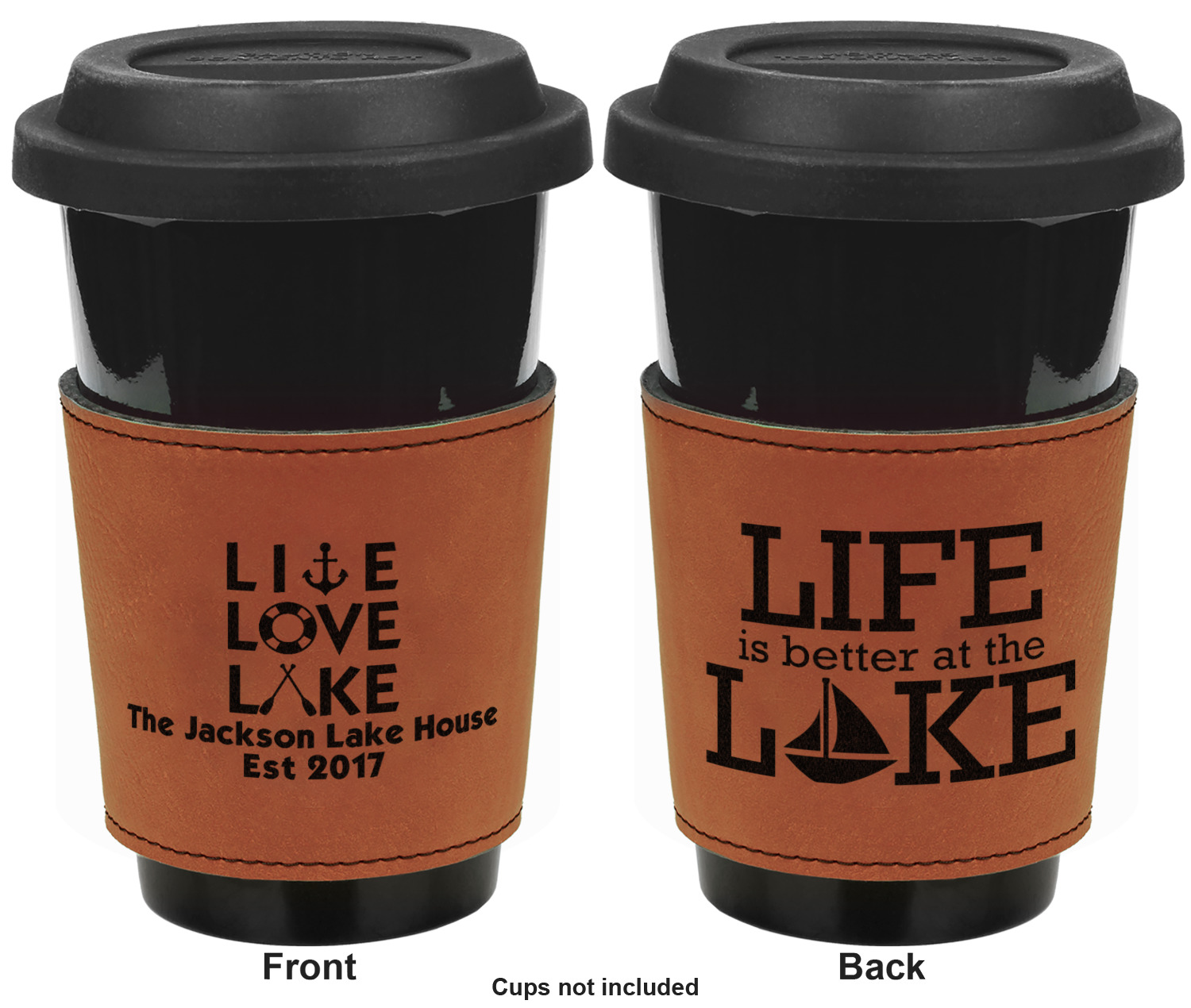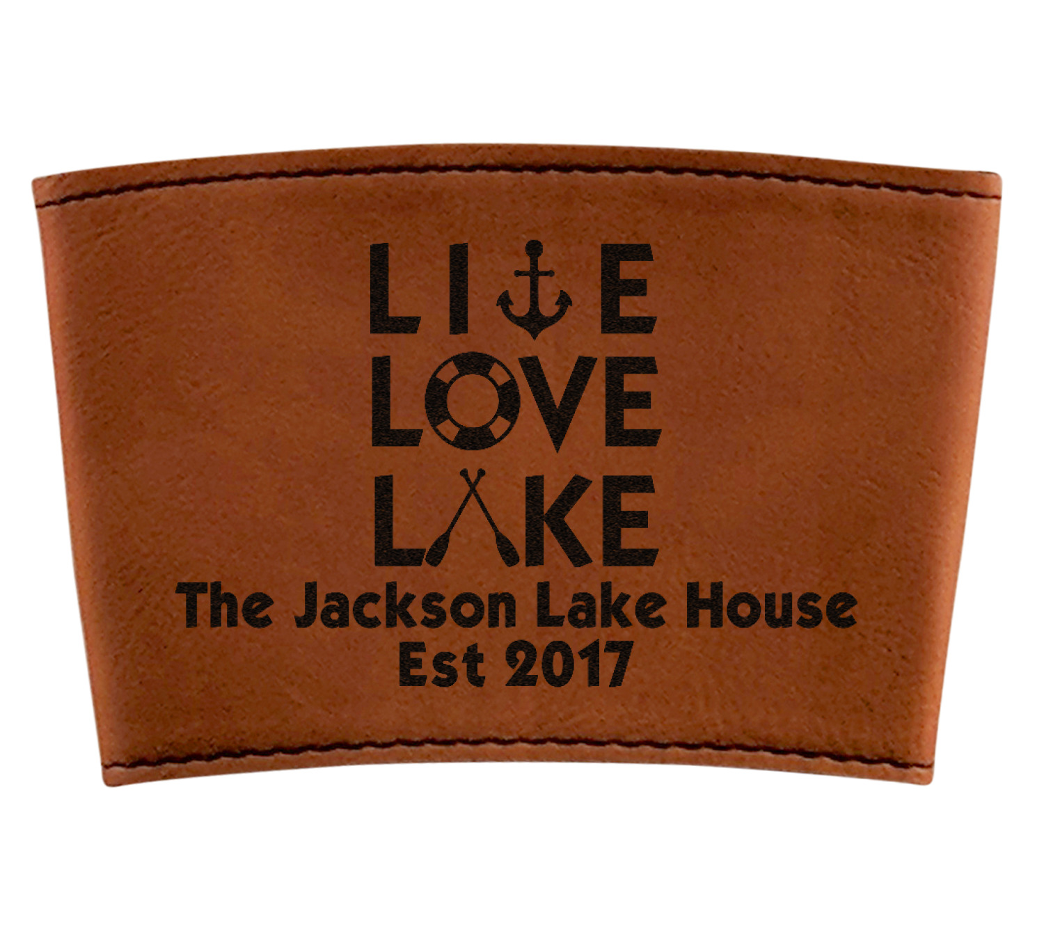 This cup sleeve is made from a suave, cognac-brown leatherette and finished with an intricate, black stitch. The interior of this can sleeve is fabricated from a thin foam material to help insulate your mug's contents. The sleeve is specifically made to suit tapered glasses or mugs, so the top's diameter is 3.5 inches, while the bottom's diameter is 2.75 inches. Your customized design will be laser engraved into the leatherette, leaving behind crisp, black imprint. With these products, we provide you with the option of engraving the front and back, or the front only.