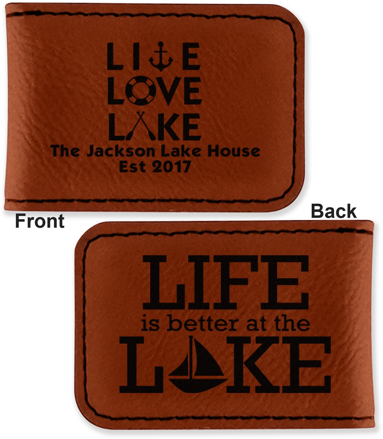 Your money clip will be laser engraved so that the design you choose will come out black. Find a fun graphic, monogram, or font to use to personalize your money clip either on just the front or the front and the back.