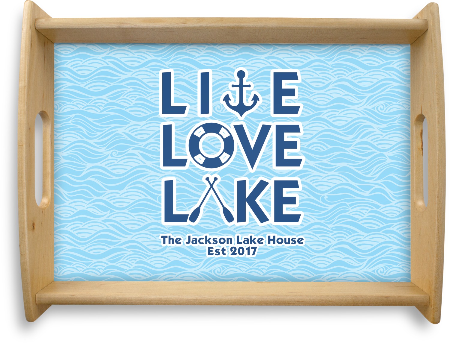 This design has a beautiful background with abstract waves that are a calming light blue. The main feature of this design is the quote. The quote used for this design says "Live Love Lake," but remember that we have many other lake house quotes to choose from. Underneath the quote you are able to put your personalization!