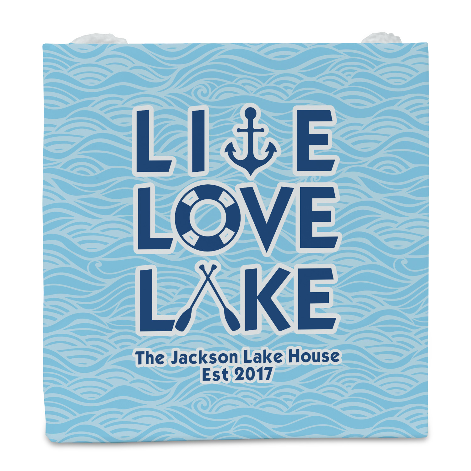 This design has a beautiful background with abstract waves that are a calming light blue. The main feature of this design is the quote. The quote used for this design says "Live Love Lake," but remember that we have many other lake house quotes to choose from. Underneath the quote you are able to put your personalization!