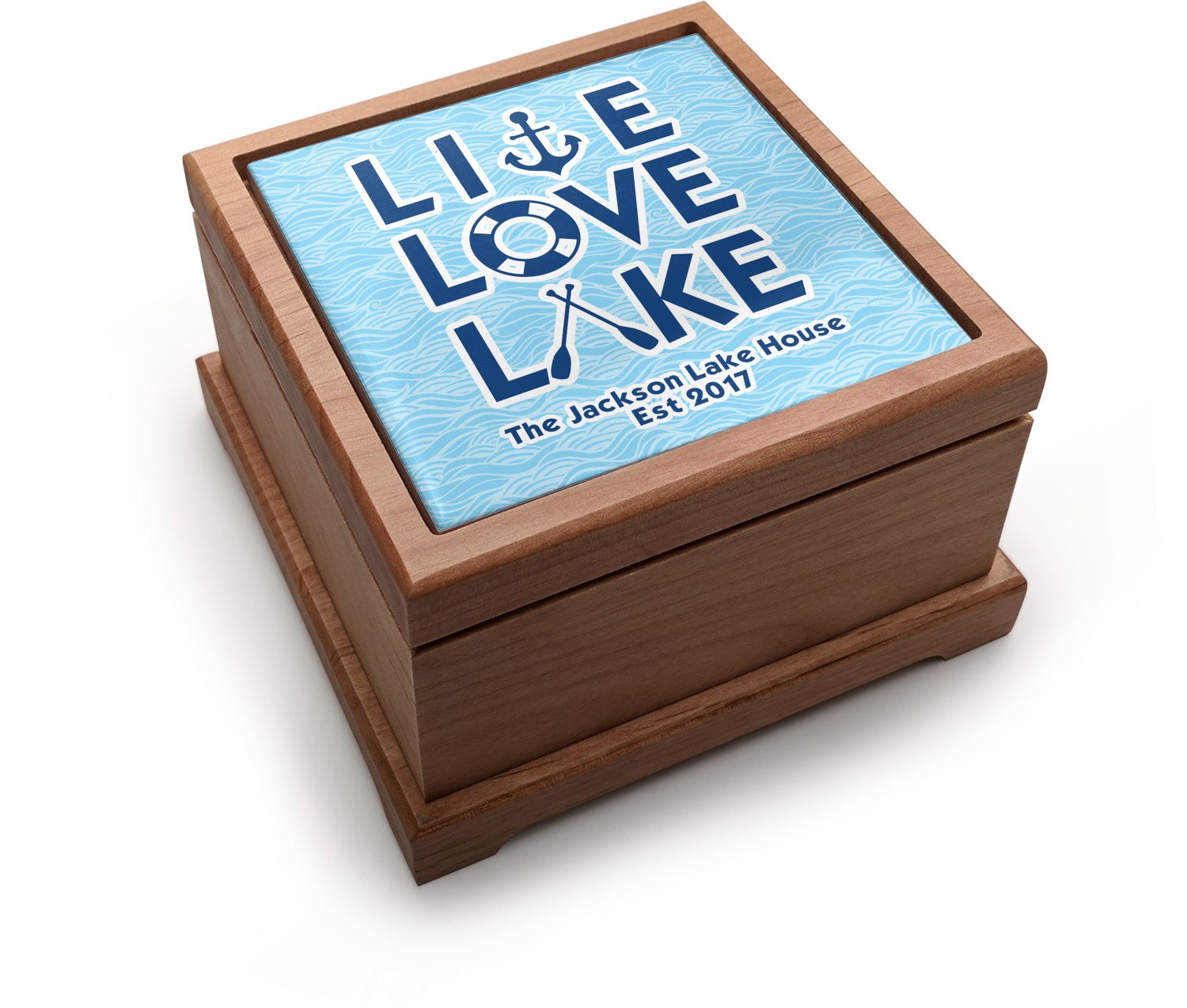 This design has a beautiful background with abstract waves that are a calming light blue. The main feature of this design is the quote. The quote used for this design says "Live Love Lake," but remember that we have many other lake house quotes to choose from. Underneath the quote you are able to put your personalization!