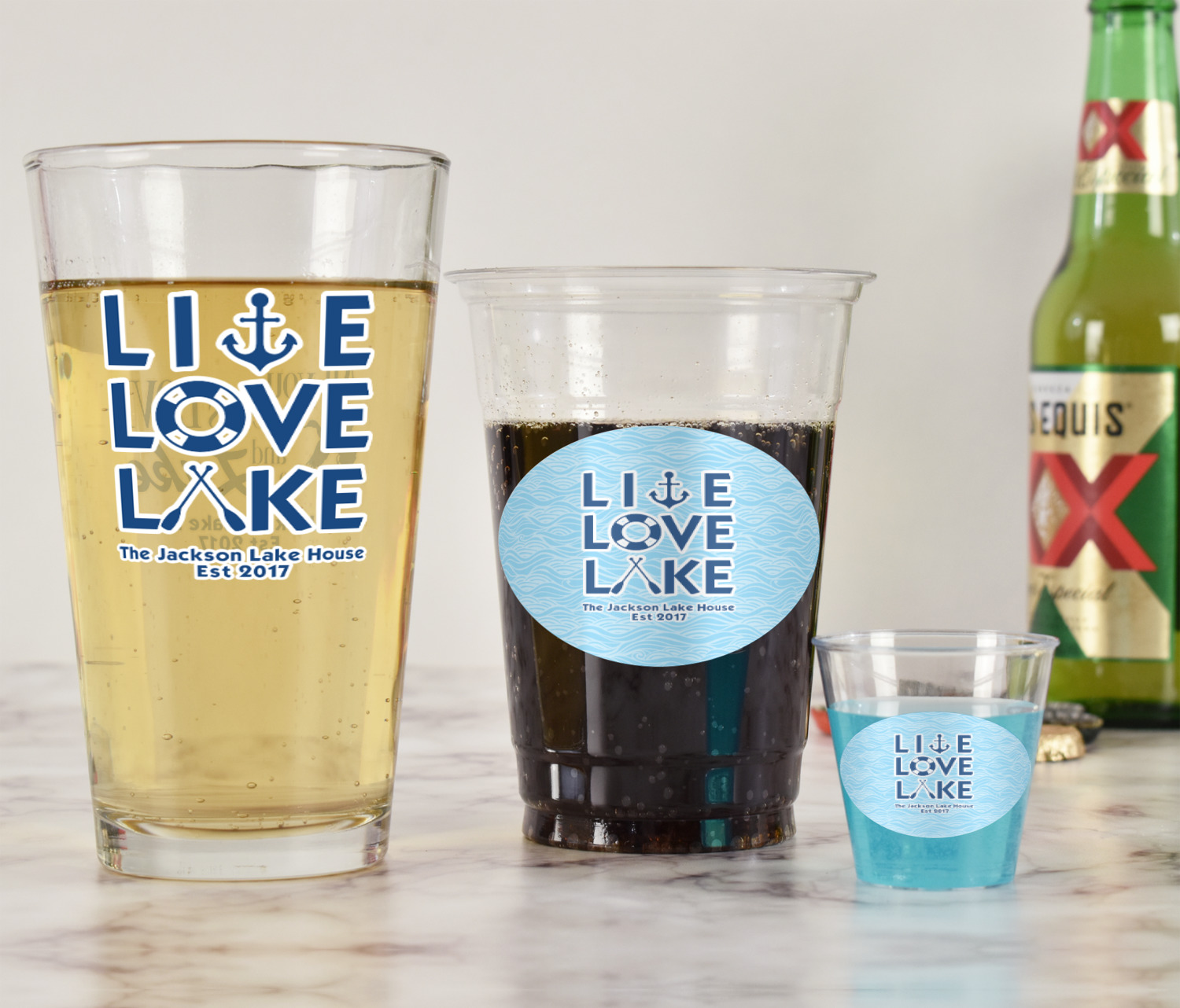 This design has a beautiful background with abstract waves that are a calming light blue. The main feature of this design is the quote. The quote used for this design says "Live Love Lake," but remember that we have many other lake house quotes to choose from. Underneath the quote you are able to put your personalization!