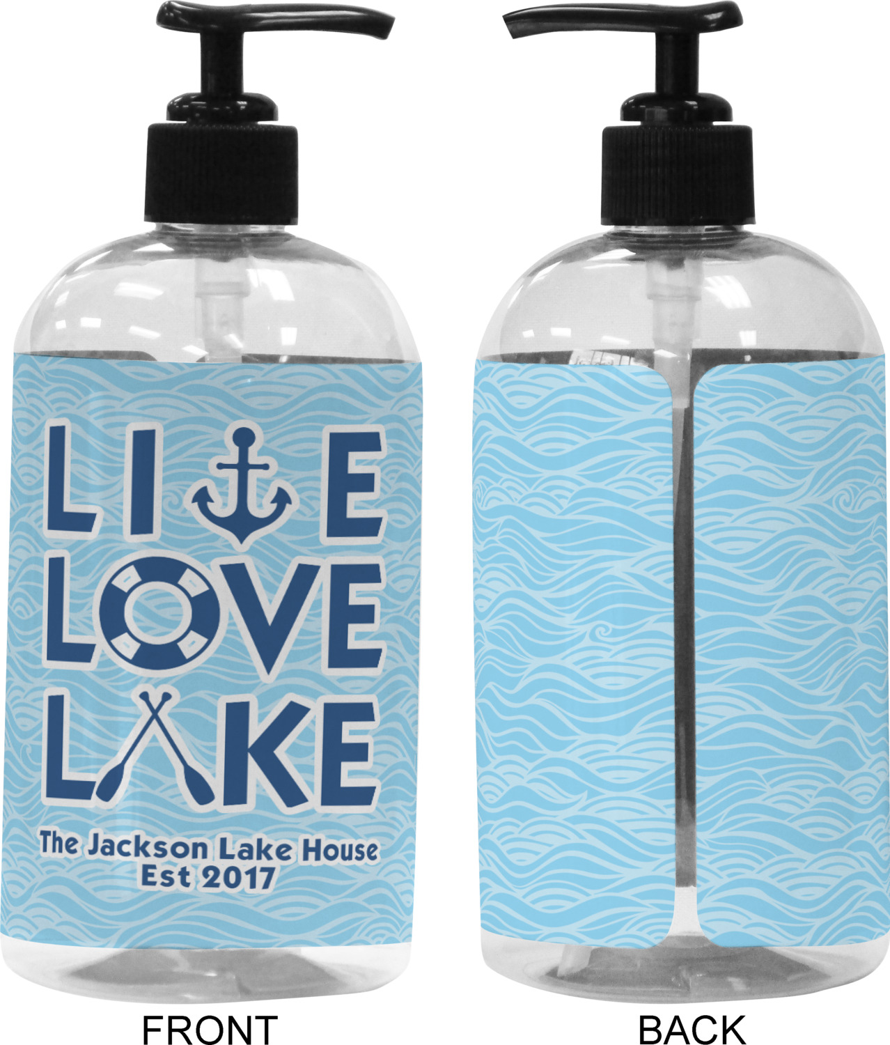 This design has a beautiful background with abstract waves that are a calming light blue. The main feature of this design is the quote. The quote used for this design says "Live Love Lake," but remember that we have many other lake house quotes to choose from. Underneath the quote you are able to put your personalization!