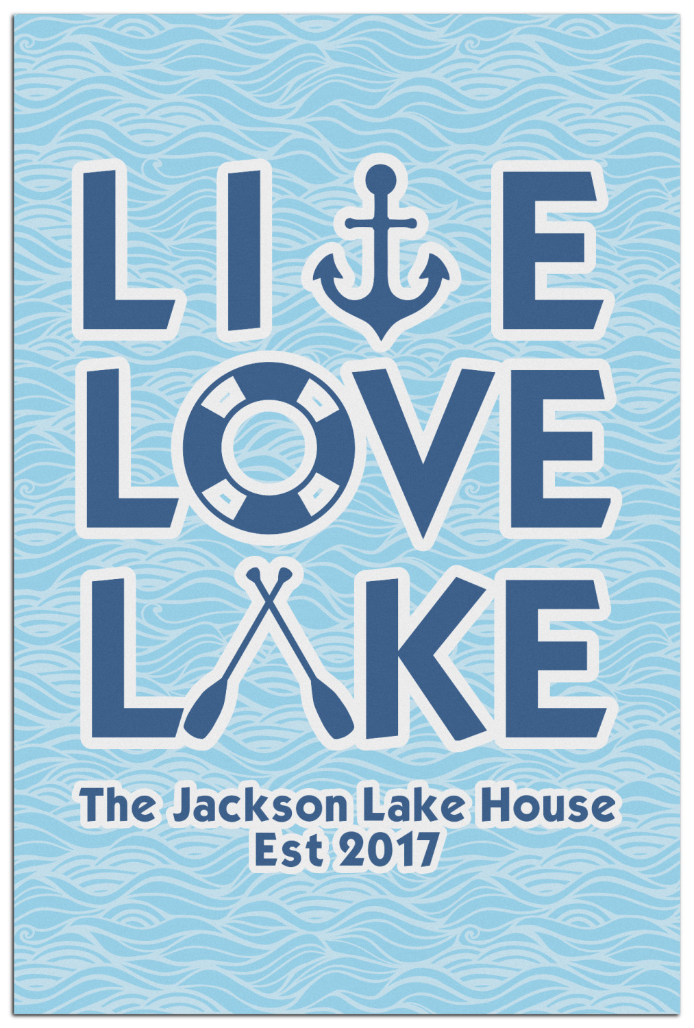 This design has a beautiful background with abstract waves that are a calming light blue. The main feature of this design is the quote. The quote used for this design says "Live Love Lake," but remember that we have many other lake house quotes to choose from. Underneath the quote you are able to put your personalization!