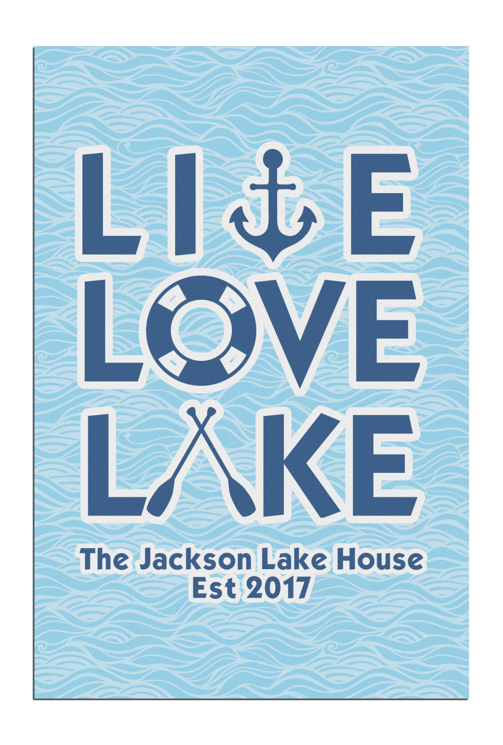 This design has a beautiful background with abstract waves that are a calming light blue. The main feature of this design is the quote. The quote used for this design says "Live Love Lake," but remember that we have many other lake house quotes to choose from. Underneath the quote you are able to put your personalization!