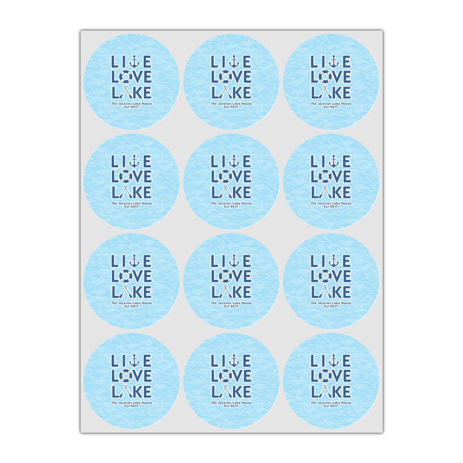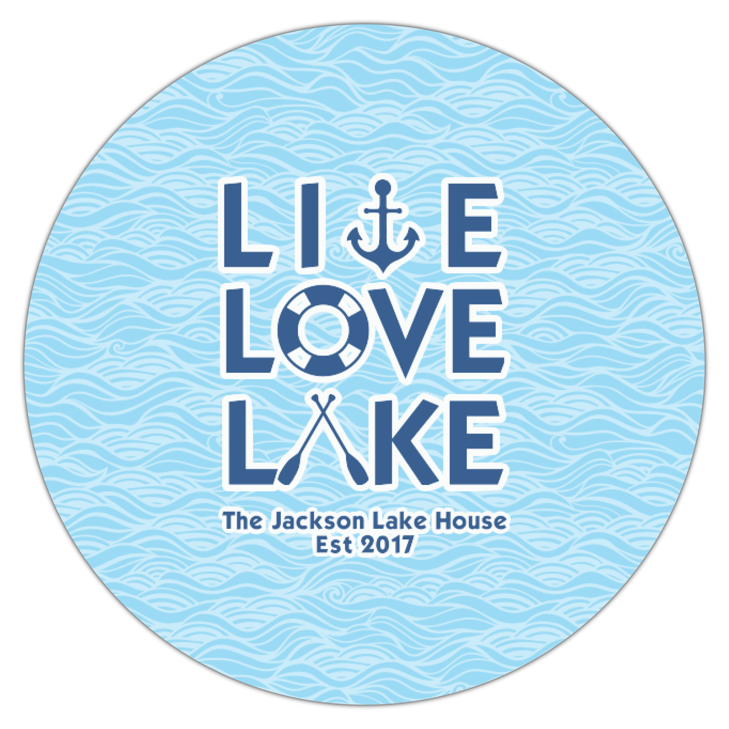This design has a beautiful background with abstract waves that are a calming light blue. The main feature of this design is the quote. The quote used for this design says "Live Love Lake," but remember that we have many other lake house quotes to choose from. Underneath the quote you are able to put your personalization!